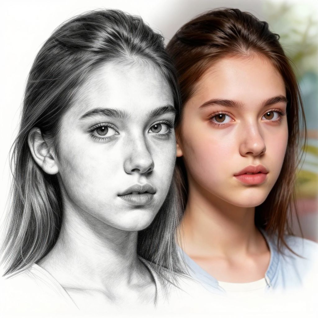 Drawing to AI image visualization featuring a black and white pencil portrait in the foreground morphing into a vibrant AI-colored version with lifelike skin tones, expressive eyes, and detailed background, emphasizing the power of AI in enhancing traditional drawings.