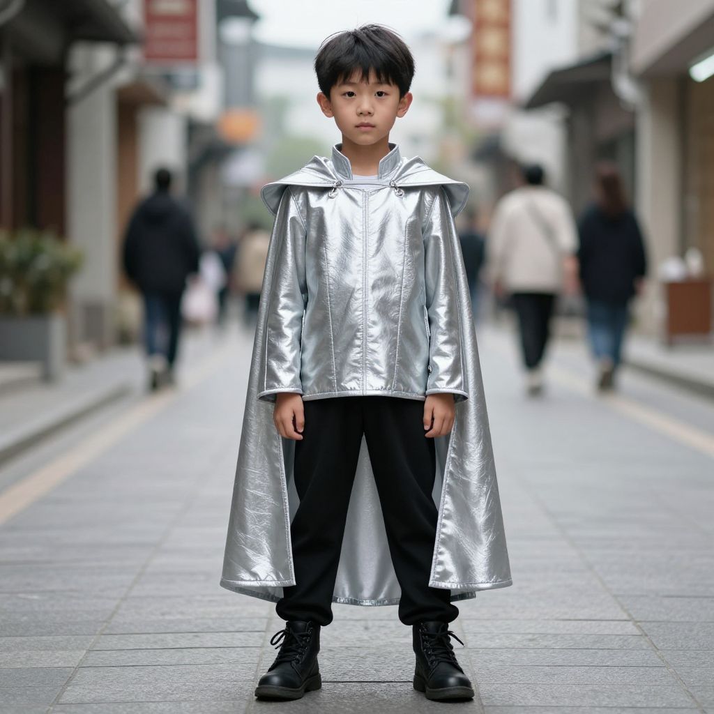 Photograph of a young Asian boy standing on a street, wearing a silver metallic cape over a black outfit and boots, with a blurred urban background.
