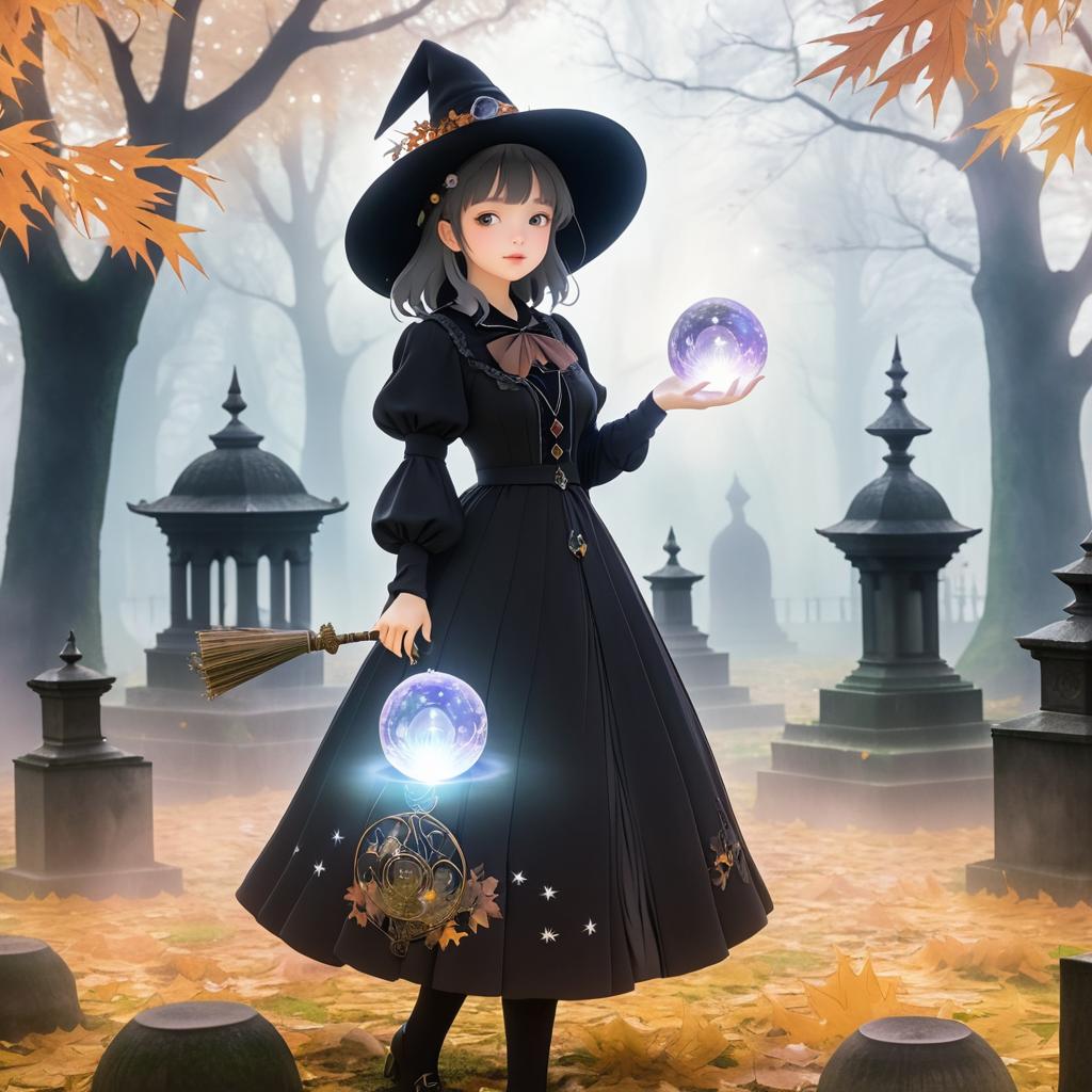 A young witch, wearing a vintage dress with a wide-brimmed hat, wielding a crystal orb, standing in a misty graveyard, surrounded by swirling autumn leaves, depicted in the folklore-inspired and haunting anime style of Shigeru Mizuki.