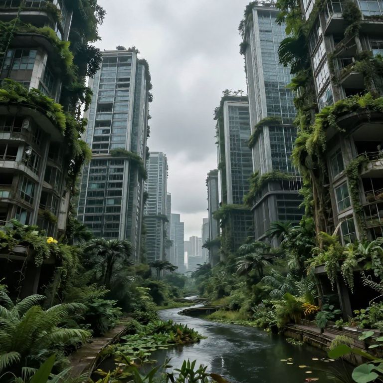 Photograph of a futuristic urban scene featuring tall, modern skyscrapers with glass facades and greenery climbing their exteriors. The buildings are surrounded by lush, dense vegetation including ferns and palm trees. A narrow, reflective waterway with lily pads runs through the center, flanked by small, overgrown islands. The sky is overcast, casting a muted light over the scene. The architectural style blends nature and modernity, creating a vibrant, almost jungle-like atmosphere in the cityscape. The image conveys a sense of serenity and integration between urban development and natural elements.