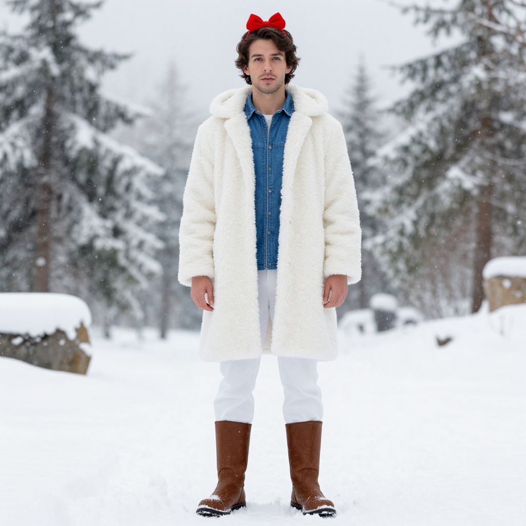 Snow White Costume Size, man in a white coat and brown boots standing in the snow