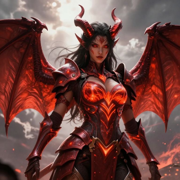 A CGI fantasy image of a fierce female demon warrior. She has glowing red-orange armor with intricate designs, large bat-like wings, and sharp horns. Her long dark hair flows behind her, and she has intense red eyes. The background is a chaotic, cloudy sky with sunlight breaking through, creating a dramatic effect. The armor highlights her large breasts, and her confident stance exudes power.