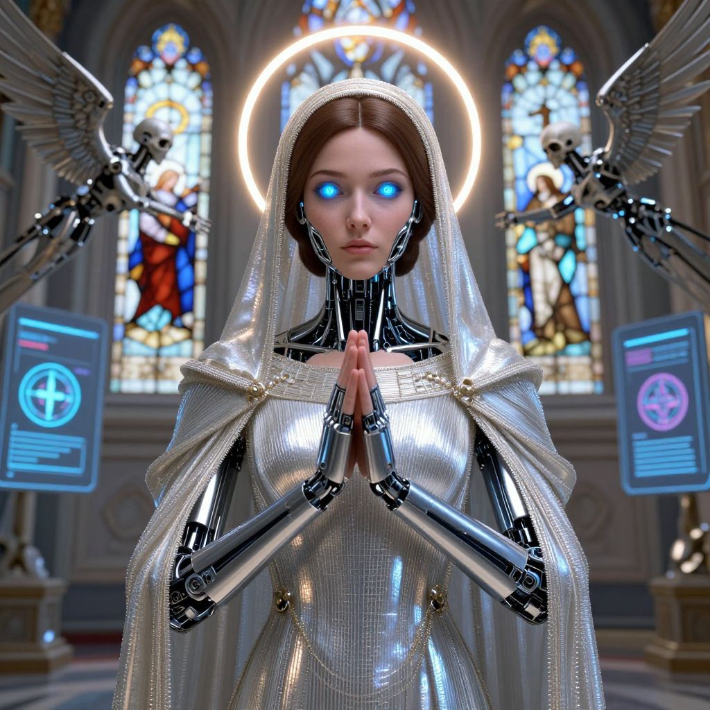 Digital illustration of a cybernetic Virgin Mary in white and blue robes, surrounded by four small robotic angels, halo glowing, dark cloudy background.