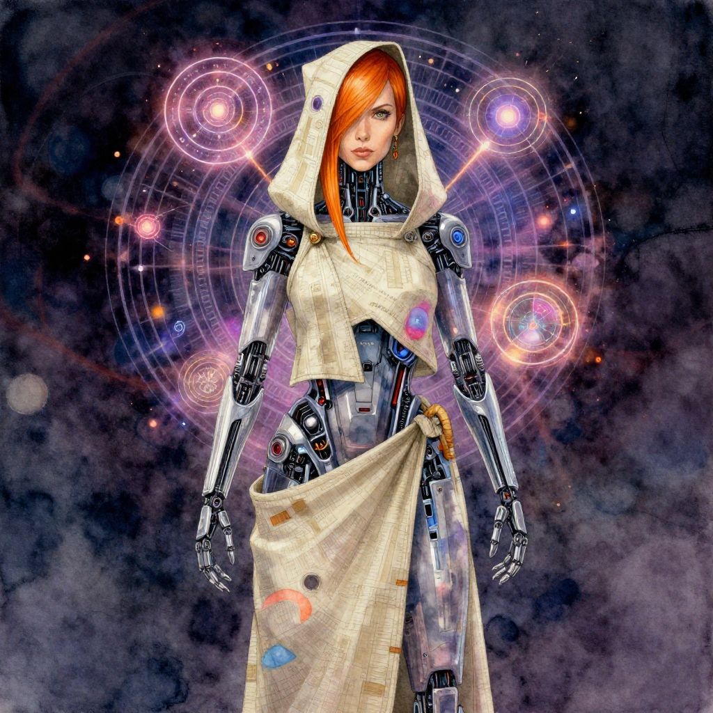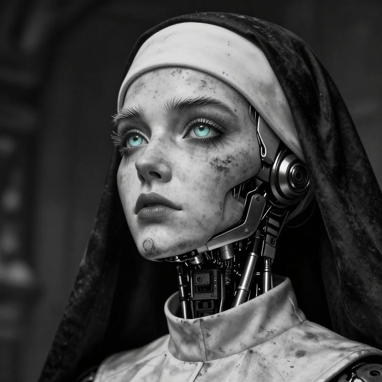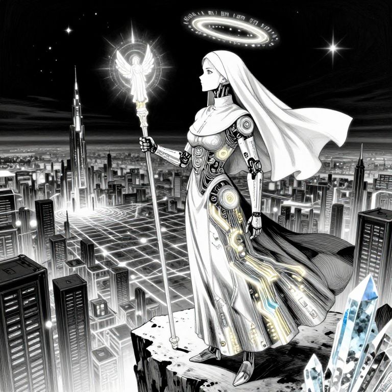 Studio anime art, detailed ink sketch, high quality digital illustration, A cybernetic Virgin Mary floats against a backdrop of dark, stormy clouds, illuminated by a soft, ethereal light, Her face, half-covered by a silver helmet with intricate filigree, contrasts the gentle human features with stark mechanical components, Her left arm is entirely cybernetic, with exposed wiring and a polished chrome finish, resembling a delicate exoskeleton, The right side of her body is wrapped in flowing blue and white silk robes, interlaced with glowing cables and circuitry, Her halo, instead of a simple golden disk, features rotating digital symbols and holographic icons, At her feet, small robotic cherubs kneel, their tiny mechanical hands clasped in prayer, The entire scene is a blend of medieval iconography with a cyberpunk aesthetic, creating a striking juxtaposition of the sacred and the technological, The art style is highly detailed, in the vein of futurist anime, capturing the beauty of the cyborg girl and the mechanical complexity of her exposed skull