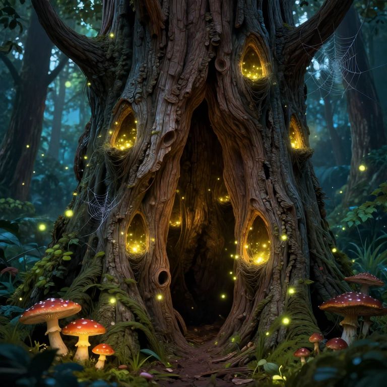 Nests hidden inside hollow tree trunks deep within an enchanted forest, illuminated by magical glowing fireflies, rich textures of bark, mushrooms, and delicate spiderwebs, fantasy art style with vibrant colors and intricate details