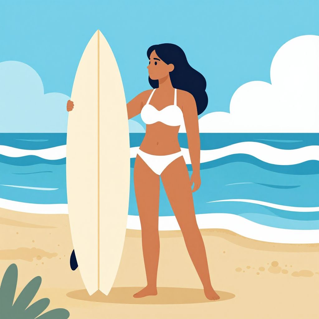 Digital illustration of a dark-skinned man in a yellow shirt and blue shorts riding a white and orange jet ski on blue water under a bright blue sky
