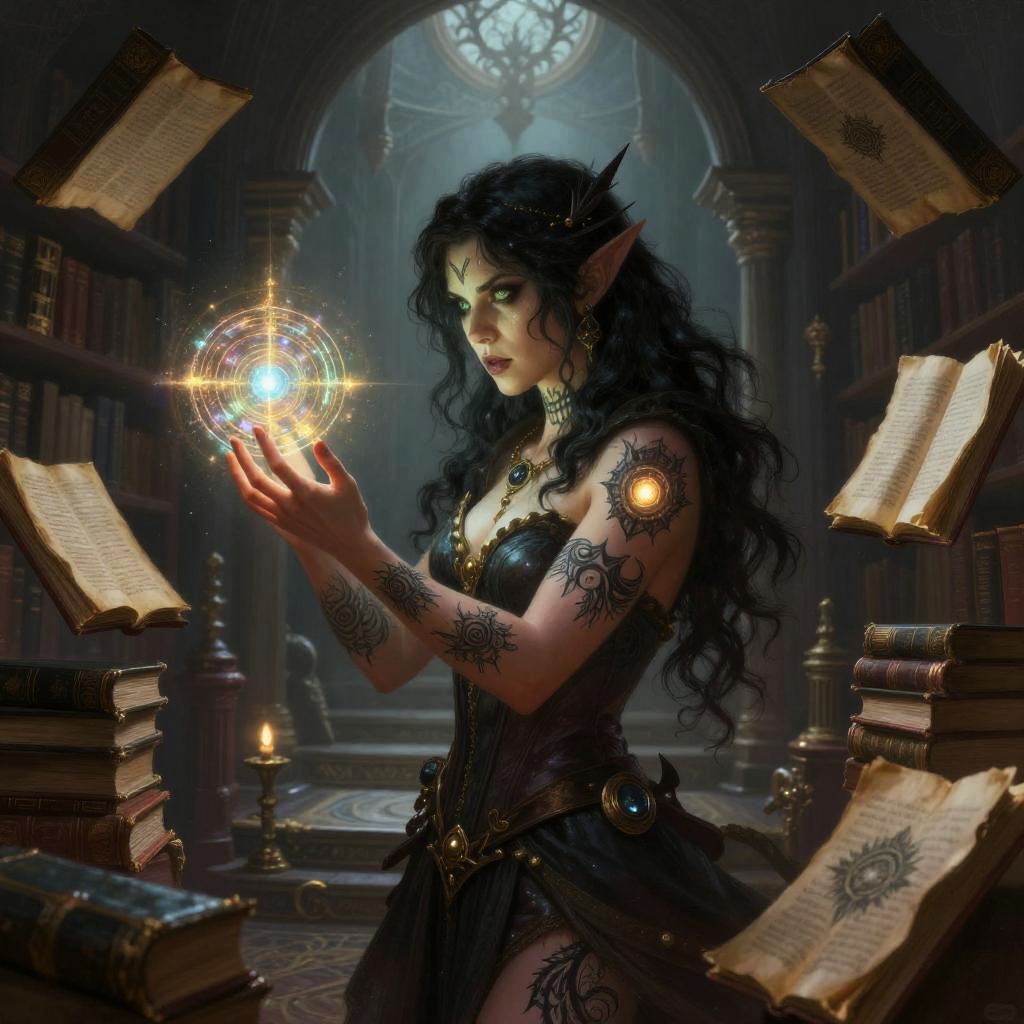 Digital fantasy artwork of a dark-haired, tattooed elven sorceress in a dimly-lit, ancient library, casting a glowing spell with