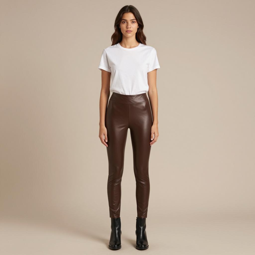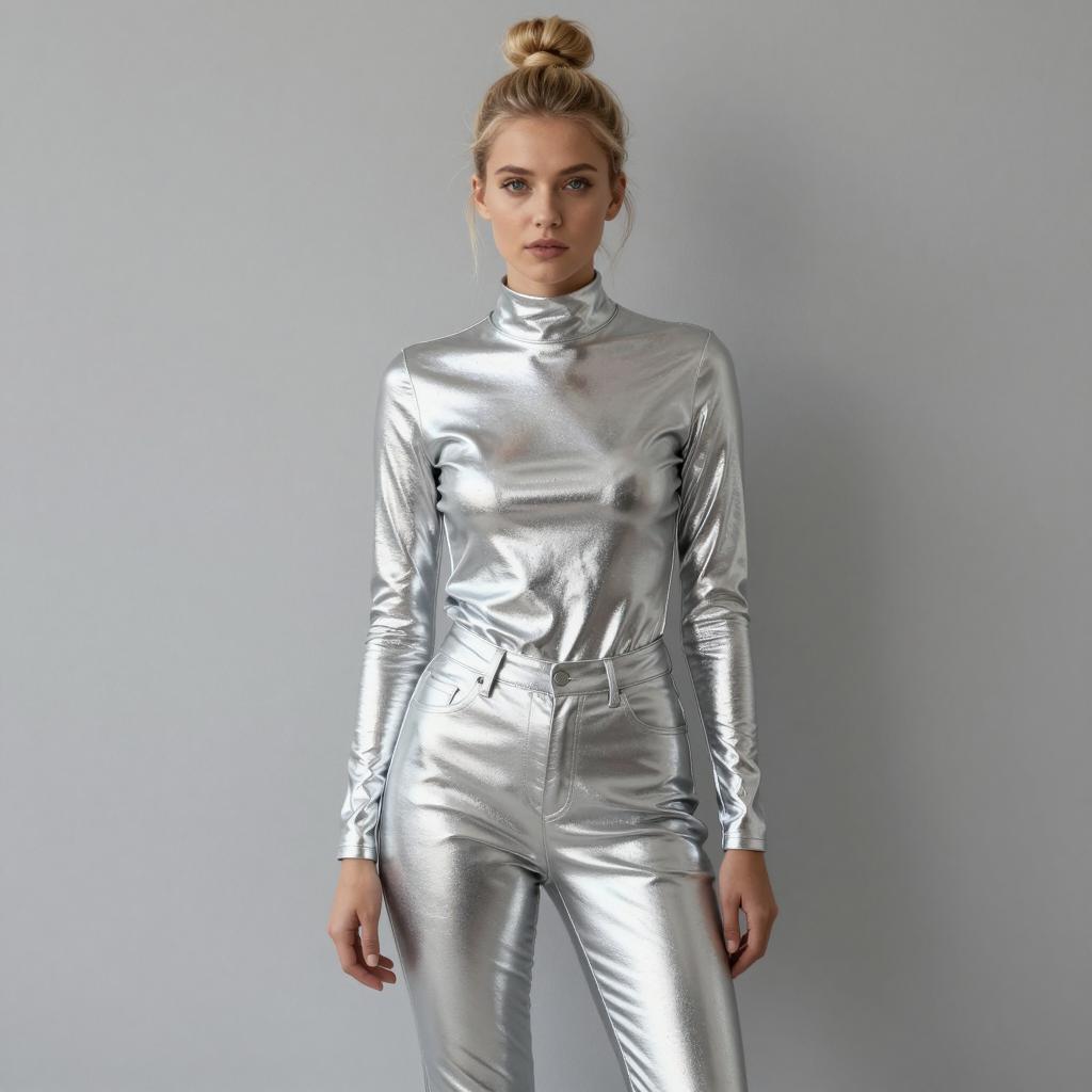 Compression leggings woman, photograph of a woman standing, full body, wearing a tight, black, long-sleeve, shiny latex bodysuit, black sneakers, light brown hair in a ponytail, neutral expression, standing in a sunlit room with a plain, beige wall background, soft shadows, realistic lighting, no accessories, athletic build, subtle muscle definition, minimal makeup, natural light, shadows on the floor, realistic ures, casual indoor setting, modern aesthetic, subtle contrast between light and shadow