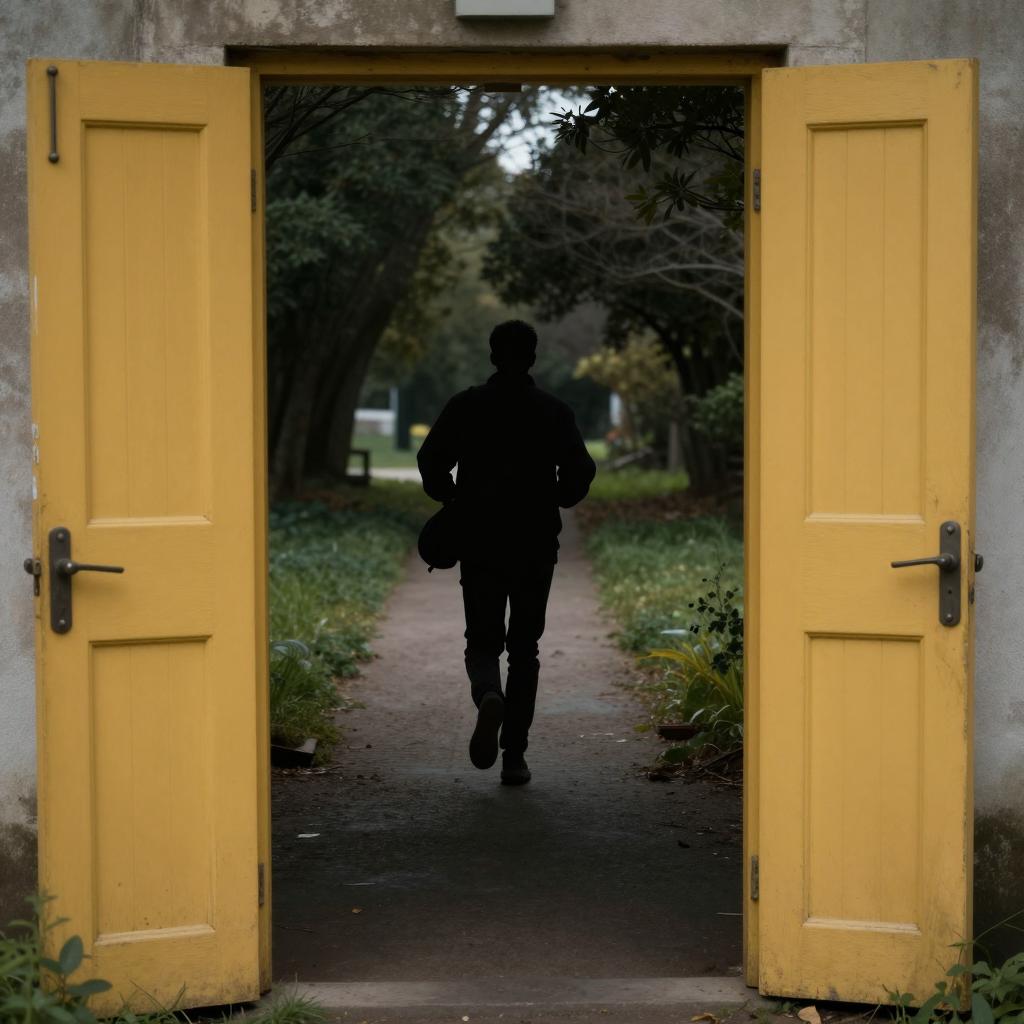 Photograph of an indoor scene. Two people in a large wooden room with high ceilings. Man in black clothing, hands behind head, facing woman with brown hair in brown jacket, seen from behind. Chandeliers, chalkboard, and wooden floor. Man stands near center, woman right foreground. Sunlight filters through windows.