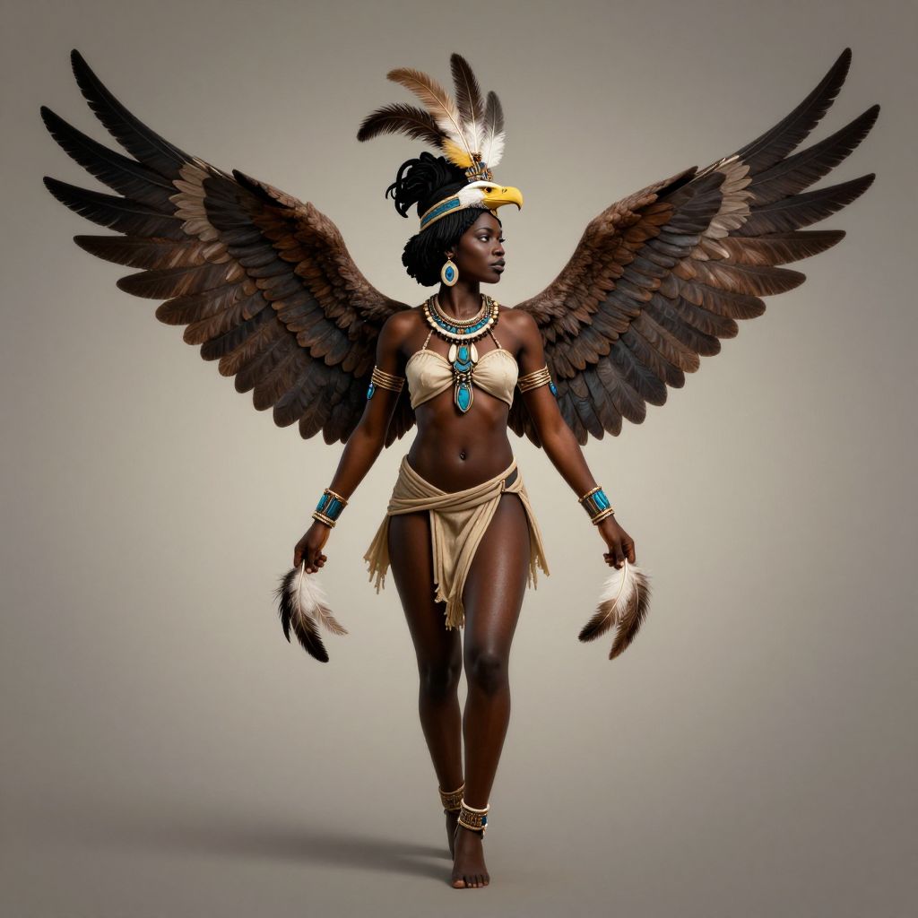 The image depicts a full-body illustration of an African woman adorned with the wings of an eagle, creating a striking and ethereal visual. She is dressed in a loincloth, which is wrapped around her waist, giving her a primitive yet elegant appearance. The woman's skin is dark, and she has a muscular build, emphasizing her strength and beauty. Her hair is styled in an elaborate, feathered headdress that complements her wings, adding a sense of majesty and power to her figure. She is wearing multiple bracelets on her arms, which are adorned with intricate designs, and her hands are adorned with feathers, further enhancing her connection to nature. The background is a simple, muted gradient, which helps to focus attention on the woman and her detailed attire. The overall composition is balanced, with the woman's figure centrally positioned, and the wings spread out, creating a sense of movement and dynamism. The interplay of colors, textures, and shapes in the illustration creates a visually captivating and dynamic scene.