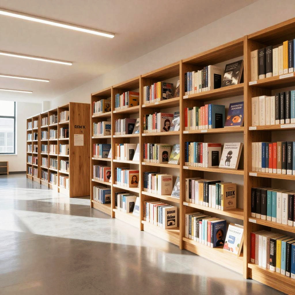 Ohwx, bookstore, bright, sunny, library, interior, wooden bookshelf, stainless steel floor, clean ceiling, minimalism, many books, store, realistic, professional light, 8k, 4k, nikon, sony, raw, fuji film