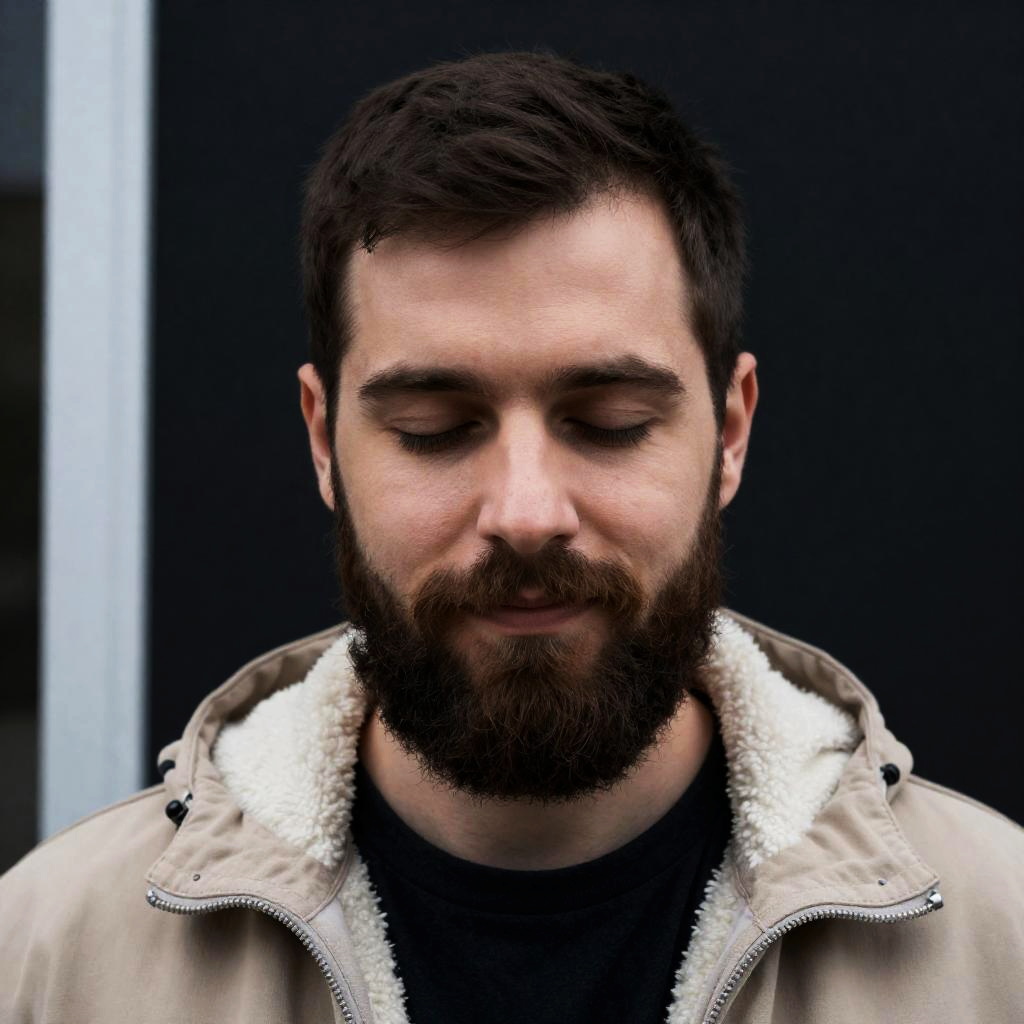 A bearded man with dark hair drinks from a can of beer against a wooden wall. He wears a dark jacket. His eyes are closed. The background has a window with a dark frame. The can has a yellow label. The man leans slightly forward.