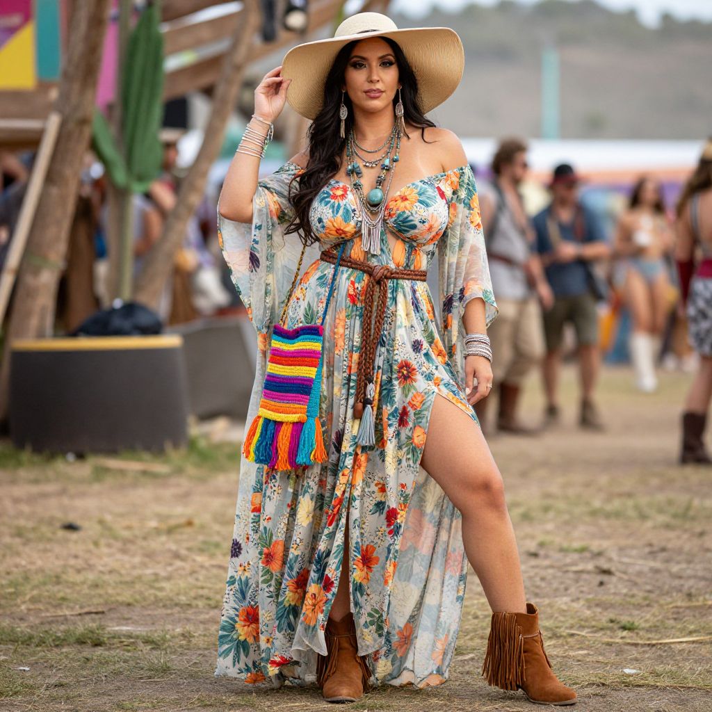 Full body shot, lanky woman, flowing maxi dress, vibrant floral patterns, lightweight cotton fabric, off-the-shoulder neckline, cinched waist with braided leather belt, layered bohemian necklaces, oversized floppy hat, wide-brimmed straw, fringed suede ankle boots, colorful woven crossbody bag, delicate silver bangles, ankle bracelets, sheer kimono jacket, long sleeves, semi-transparent chiffon, earthy tones, playful tassels, eclectic mix of textures, festival vibe Sexy. Pretty face and beаutiful eyes. Big breasts