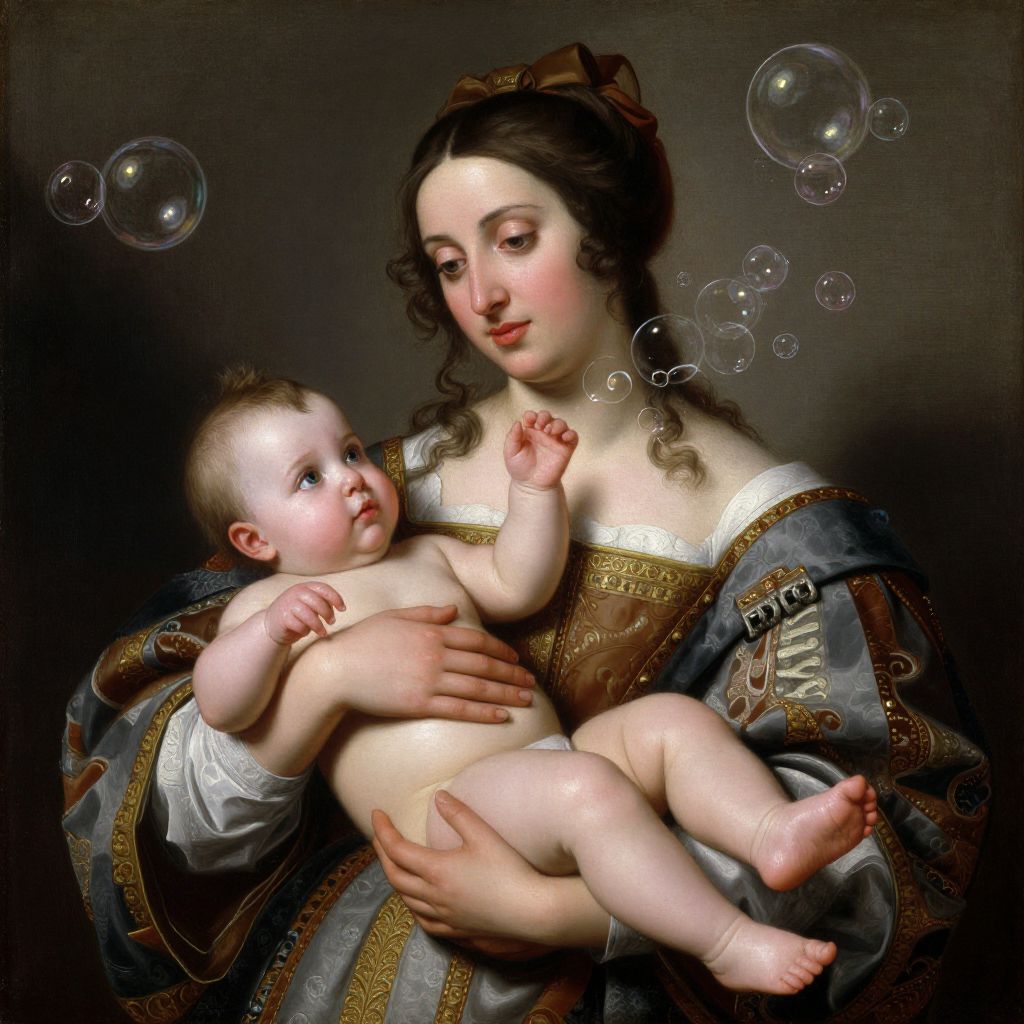 Woman in ornate attire cradles a baby while delicate soap bubbles float gracefully above her shoulder, evoking Isaac Newton's 17th-century discovery of light refraction, rendered in meticulous oil on canvas by Pelagio Pelagi in 1827, Italy.