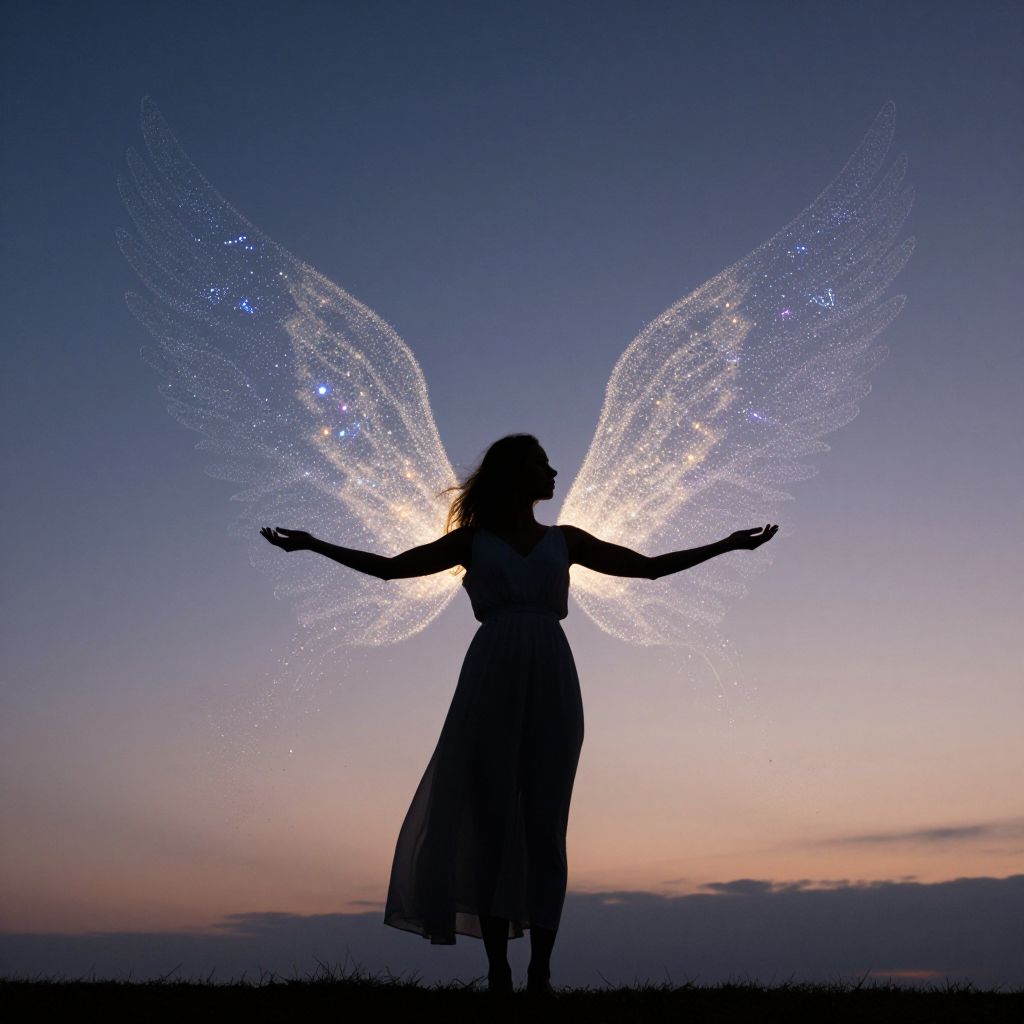 A woman stands silhouetted against a twilight sky, her outstretched arms cradling ethereal, glowing wings composed of shimmering particles that cascade like shattered dreams and recycled constellations, dissolving into fleeting gusts of poetic wind as dawn approaches.