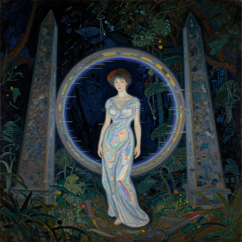Oil painting in ukiyo-e style depicting a holographic glitched projection of a woman standing in front of twin obelisks forming a circular warp portal. The scene is set at night in a dark jungle, with rich foliage and abstract glitch effects adding a surreal dimension. The artwork combines influences from Edgar Degas, Pierre-Auguste Renoir, Claude Monet, and Vincent Van Gogh.
