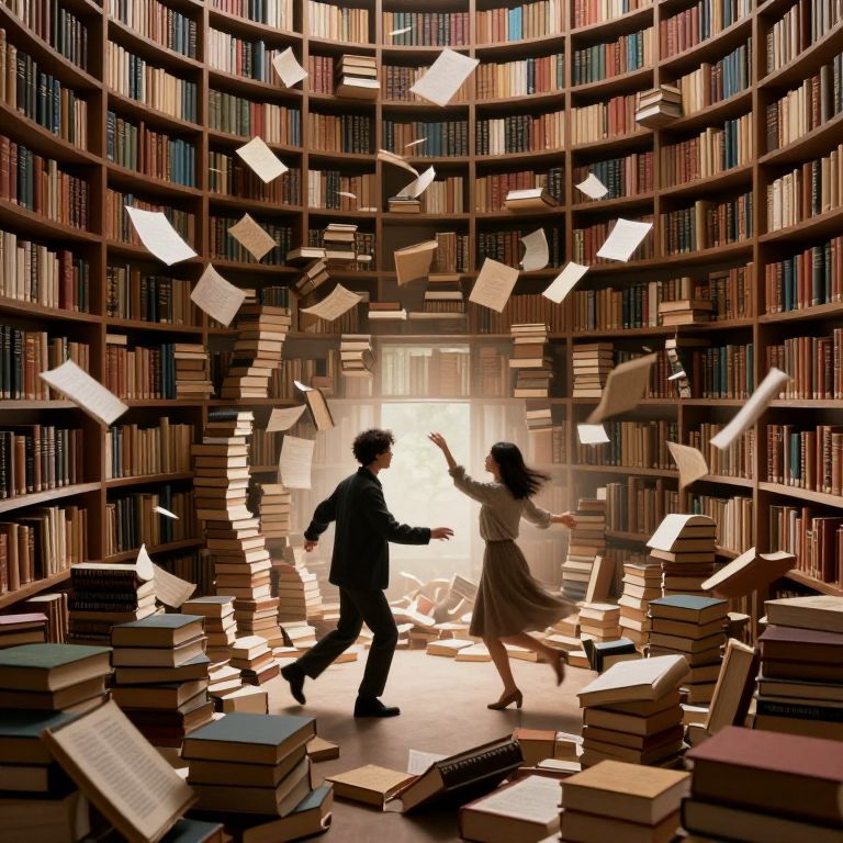 In a labyrinthine library where gravity surrenders to the whims of knowledge, two figures stand amidst a cascade of books, their silent exchange echoing the weightless dance of ideas and the timeless struggle between order and chaos.