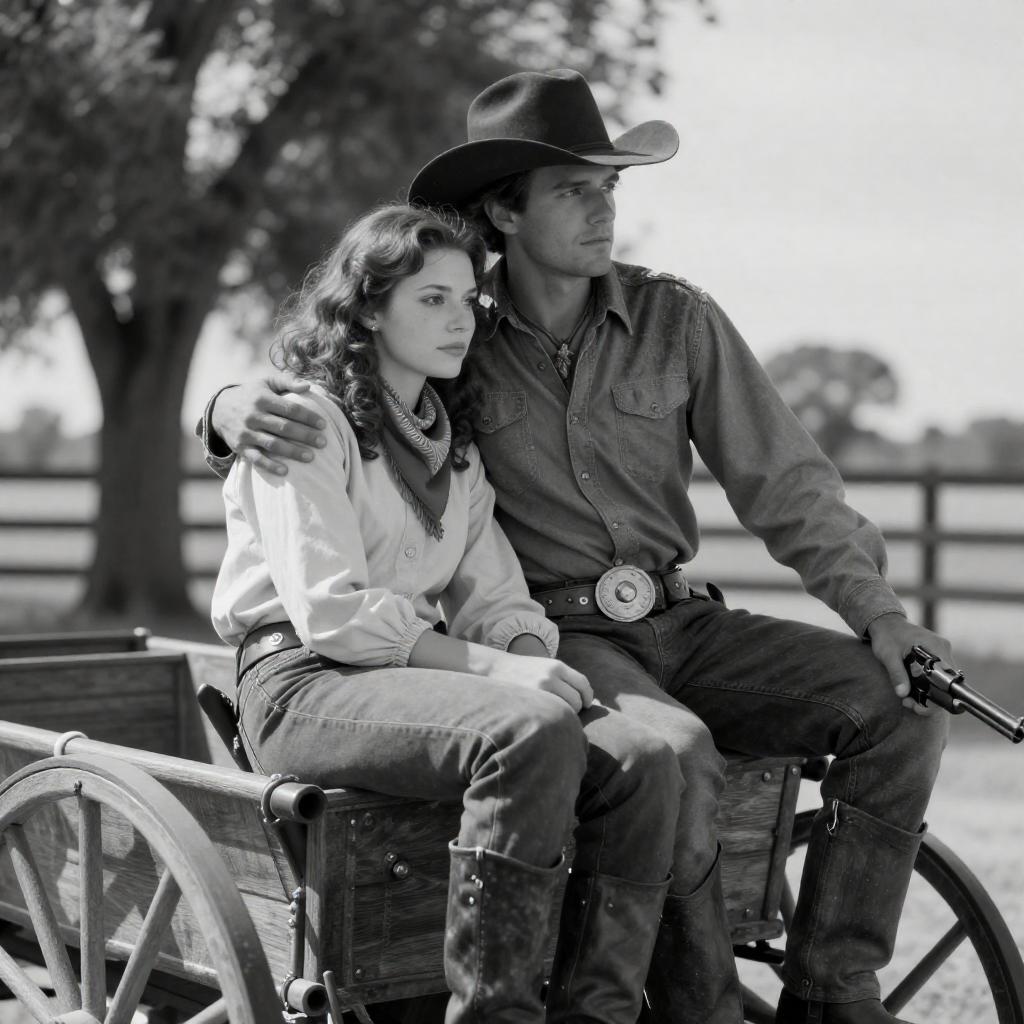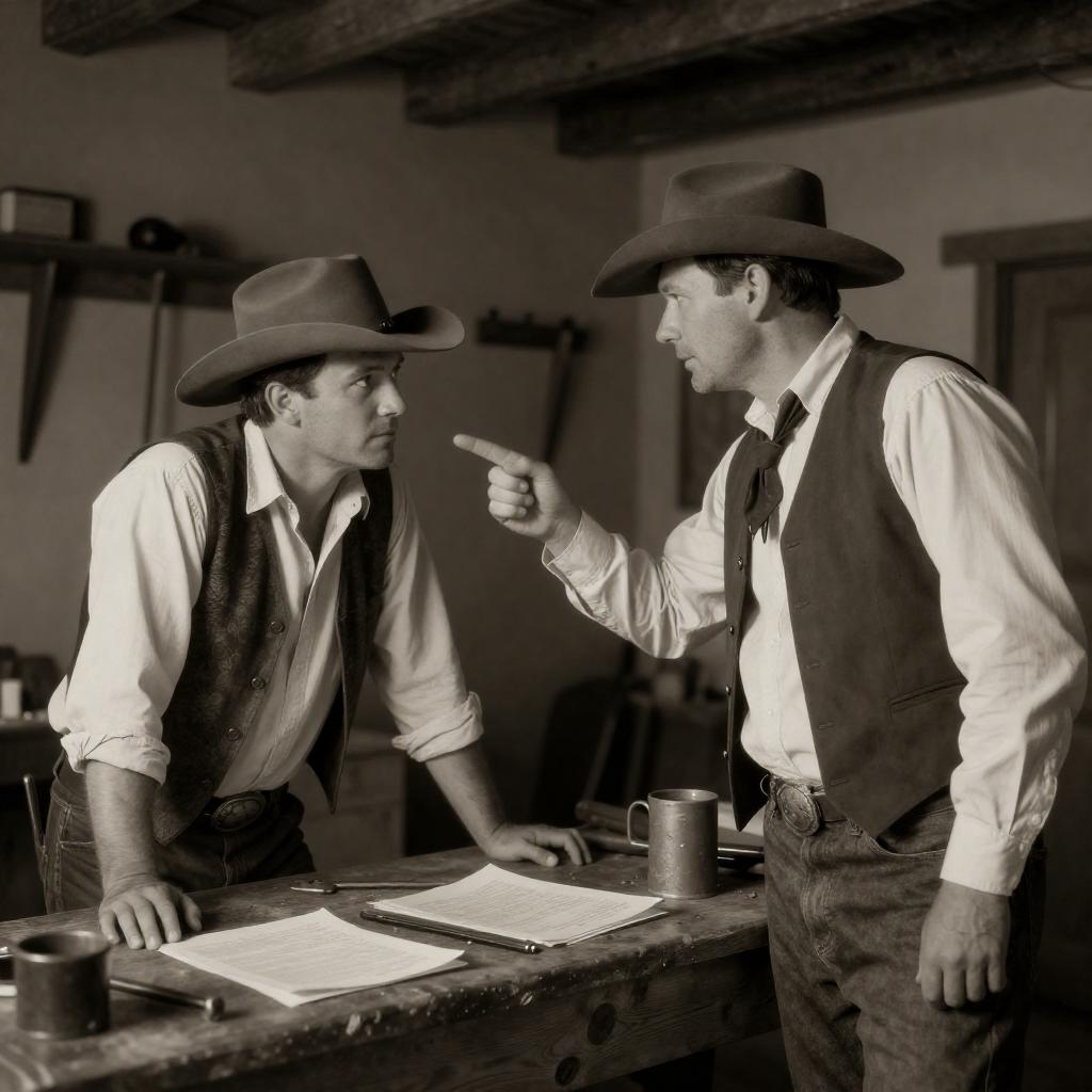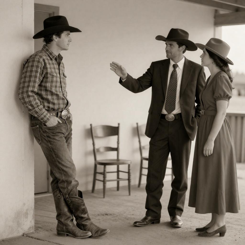 Sepia-toned photograph of a Western scene. A cowboy in a plaid shirt, hat, and boots stands left, leaning on a wall. A man in a dark suit and tie gestures right, while a woman in a long dress and hat stands beside him. Two chairs are in the background.