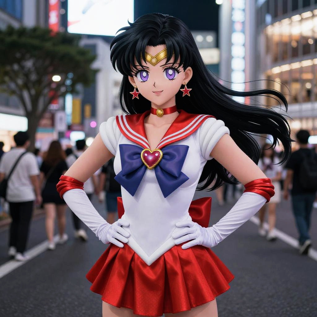 (masterpiece:1.2), best quality, ultra high res, unity 8k wallpaper, (illustration:1.0), (beautiful detailed eyes:1.6), extremely detailed face, Cinematic lighting, high contrast, clear color, (perfect hands, perfect anatomy), (dynamic angle and pose:1.3), best angle, (1girl, solo:1.5), smooth, simple, sailor mars, hino rei, breasts, very long hair, (purple eyes:1.1), black hair, thighs, sailor senshi uniform, heart brooch, gloves, red sailor collar, skirt, jewelry, earrings, choker, elbow gloves, red skirt, sailor collar, white gloves, covered navel, star earrings, tiara, pleated skirt, bow, impossible clothes, seductive smile, happy, (night:1.4), (shibuya:1.4), (downtown:1.4), (street:1.4), (walking:1.4), cowboy shot