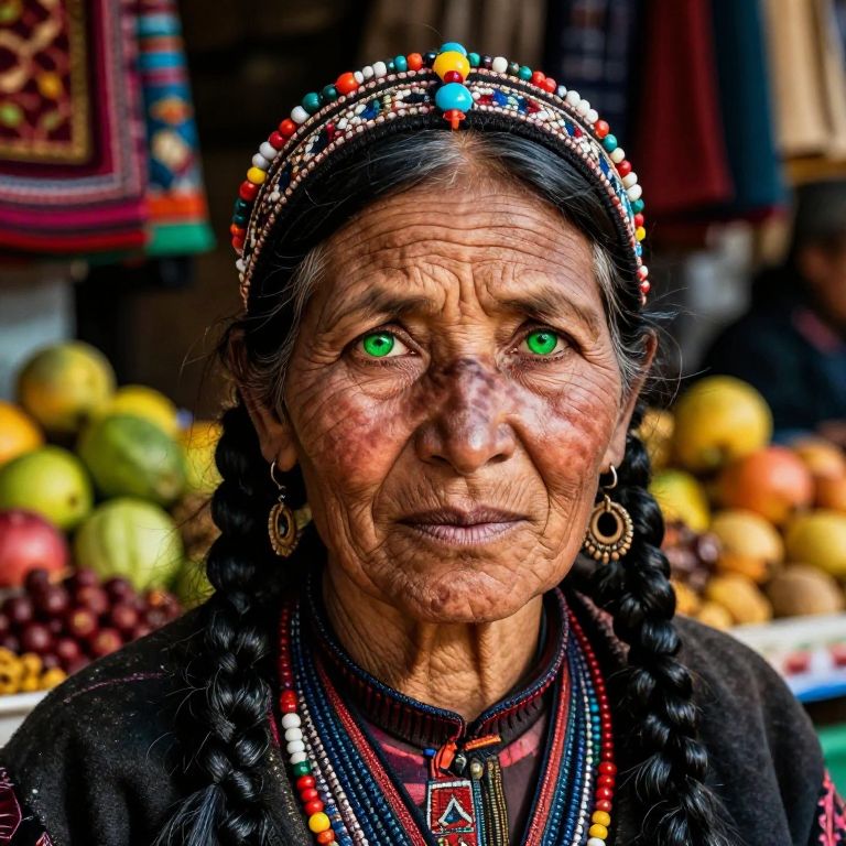 Photograph of an elderly Indigenous woman with green eyes, braided black hair, colorful beaded headband and jewelry, standing in a market with vibrant