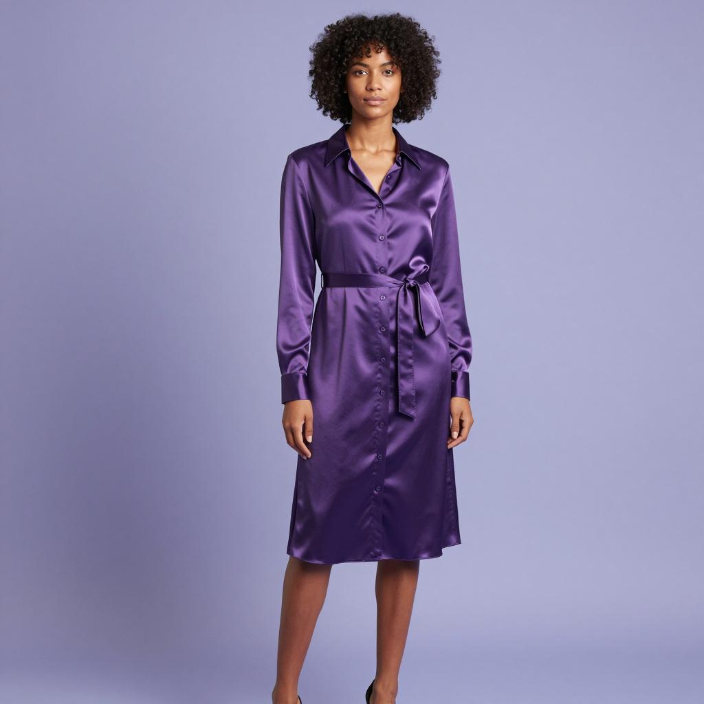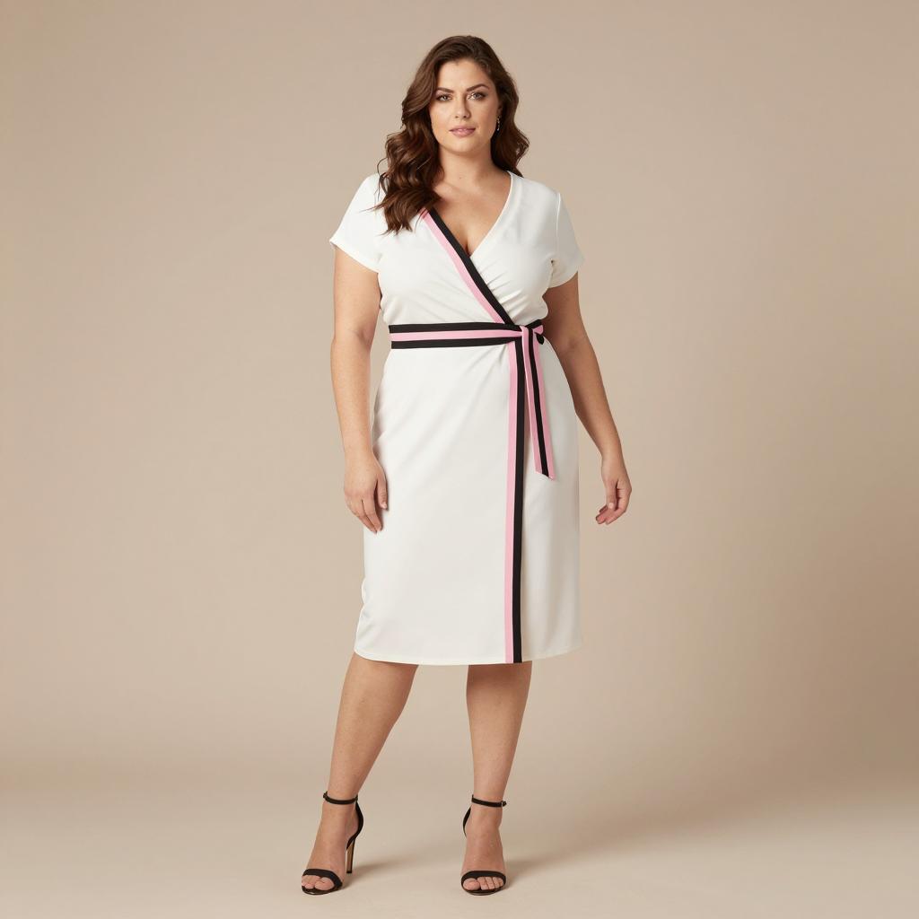 Photorealistic full-body portrait of a woman with light brown wavy hair wearing a teal floral summer dressing gown with red roses, blue trim, loose sleeves, and a pink tie belt. She stands barefoot with hands in pockets against a beige background in a relaxed, casual pose with natural makeup and soft lighting.