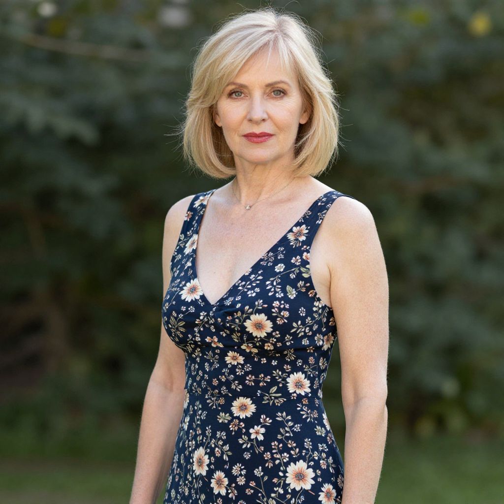 Photograph of a middle-aged blonde woman with shoulder-length hair, wearing a sleeveless, navy blue floral dress, standing outdoors against a blurred green background