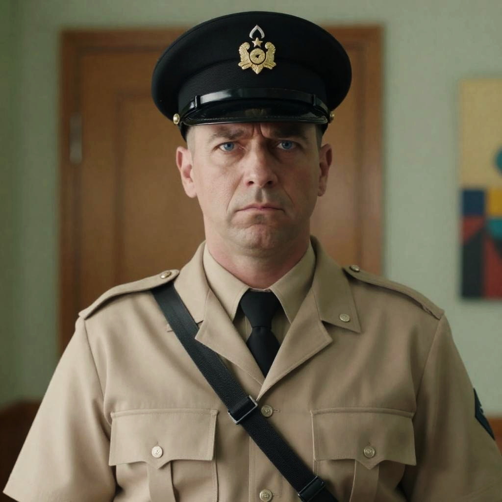 Photograph of two men in a vintage setting. A heavyset police officer with a brown uniform and cap, gripping the lapel of a bald man in a green patterned suit and brown fedora. The officer's face shows intense focus, the other man's expression is neutral. Background includes industrial elements and soft light.