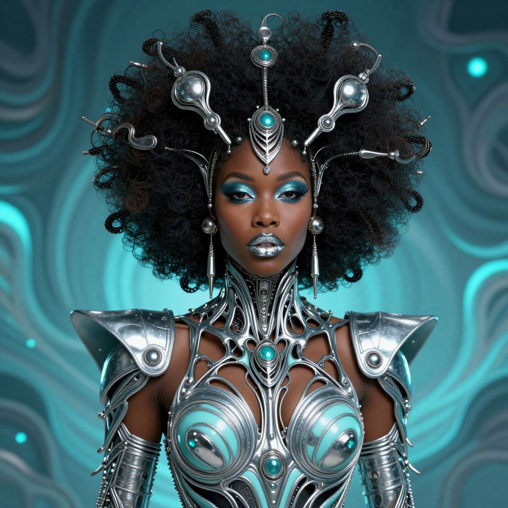 The image depicts an exotic woman with an afrofuturistic style, characterized by darkly detailed, organic biomorphic forms. Her hair is styled in an elaborate, voluminous afro, adorned with intricate, metallic ornaments that resemble ancient, ornate headdresses. The makeup is striking, with metallic eyeshadow and a glossy, silver lip color, adding to the futuristic aesthetic. She is wearing a highly detailed, silver and light cyan armor that features complex, interlocking designs, reminiscent of advanced technology or alien craftsmanship. The background is a blend of dark and light cyan hues, with swirling patterns that enhance the otherworldly atmosphere. The overall composition is dynamic, with the woman's figure centrally positioned, her gaze directed forward, creating a sense of depth and focus. The interplay of colors, textures, and shapes creates a visually rich and immersive experience, capturing the essence of afrofuturism.