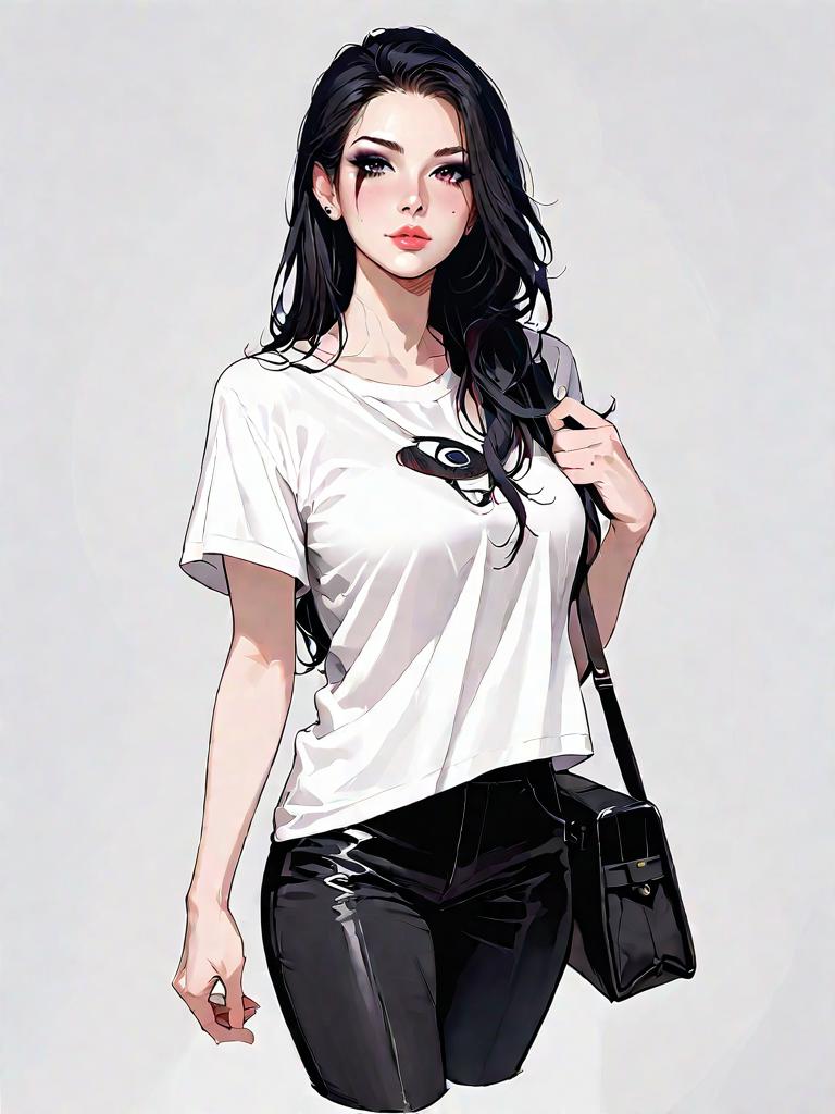 Digital illustration of a stylish young woman with a realistic face and long straight black hair. She is wearing a loose-fitting white scoop neck t-shirt with short sleeves tucked into mid-rise black cropped straight-leg trousers. She carries a black leather shoulder bag. The woman has natural makeup and a confident pose against a plain white studio background.