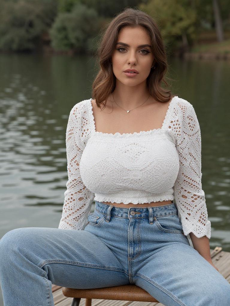 Photograph of a young Caucasian woman with wavy brown hair, sitting on a wooden stool by a calm lake. She wears a white, crocheted, long-sleeve crop top that accentuates her large breasts and high-waisted, light blue jeans. Her makeup is natural, with a subtle pink lip. The background shows a serene lake with green trees on the far side. The image has a soft focus effect, making the background slightly blurred. She sits with her legs apart, exuding a confident, relaxed demeanor. The overall tone is natural and serene.