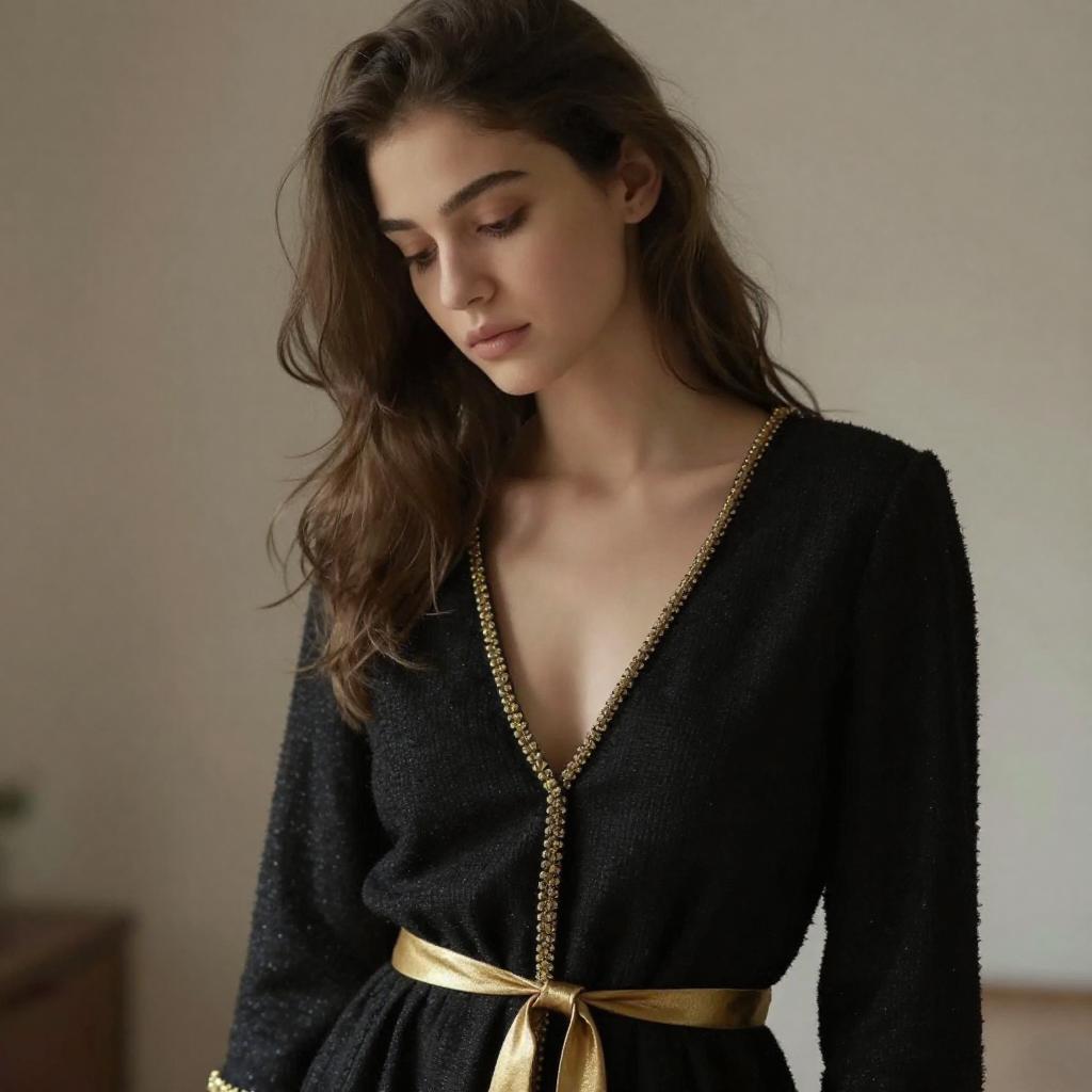 Photograph of a young woman with long brown hair, wearing a deep V-neck, black, textured dress with gold embellishments on the edges and a gold tie belt. She's looking down with a slight tilt, casting a soft shadow. The lighting is soft and even, creating a gentle contrast. The camera angle is slightly low, capturing her from the waist up. The background is plain and blurred, keeping focus on her. Depth of field is shallow.