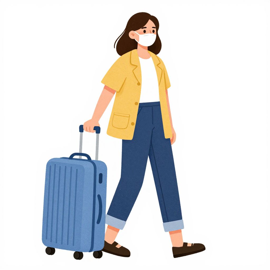 This is a digital illustration of a young woman with light skin and long brown hair, walking to the right. She wears a bright yellow jacket over a white t-shirt, blue high-waisted, cuffed pants, and black shoes. She holds a blue, upright rolling suitcase with her right hand. The background is white, making her and the suitcase the focal points. The illustration has a simple, flat color style with bold outlines and minimal shading, giving it a clean, modern look.