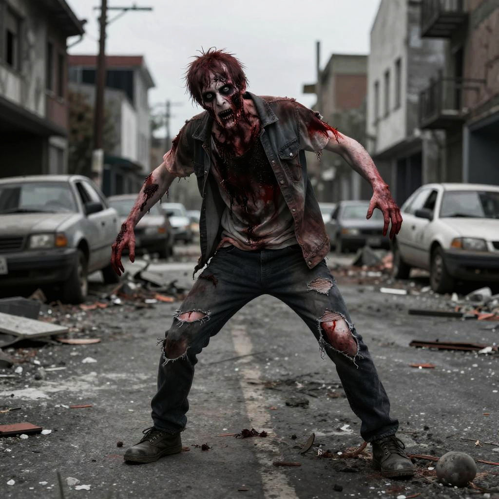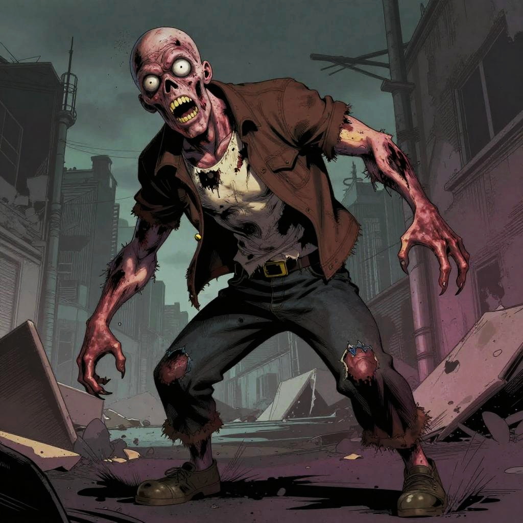 Stylized zombie pose in a comic book style, exaggerated features and ragged clothing, vibrant yet dark color palette, dynamic motion lines, undead horror theme with urban decay backdrop