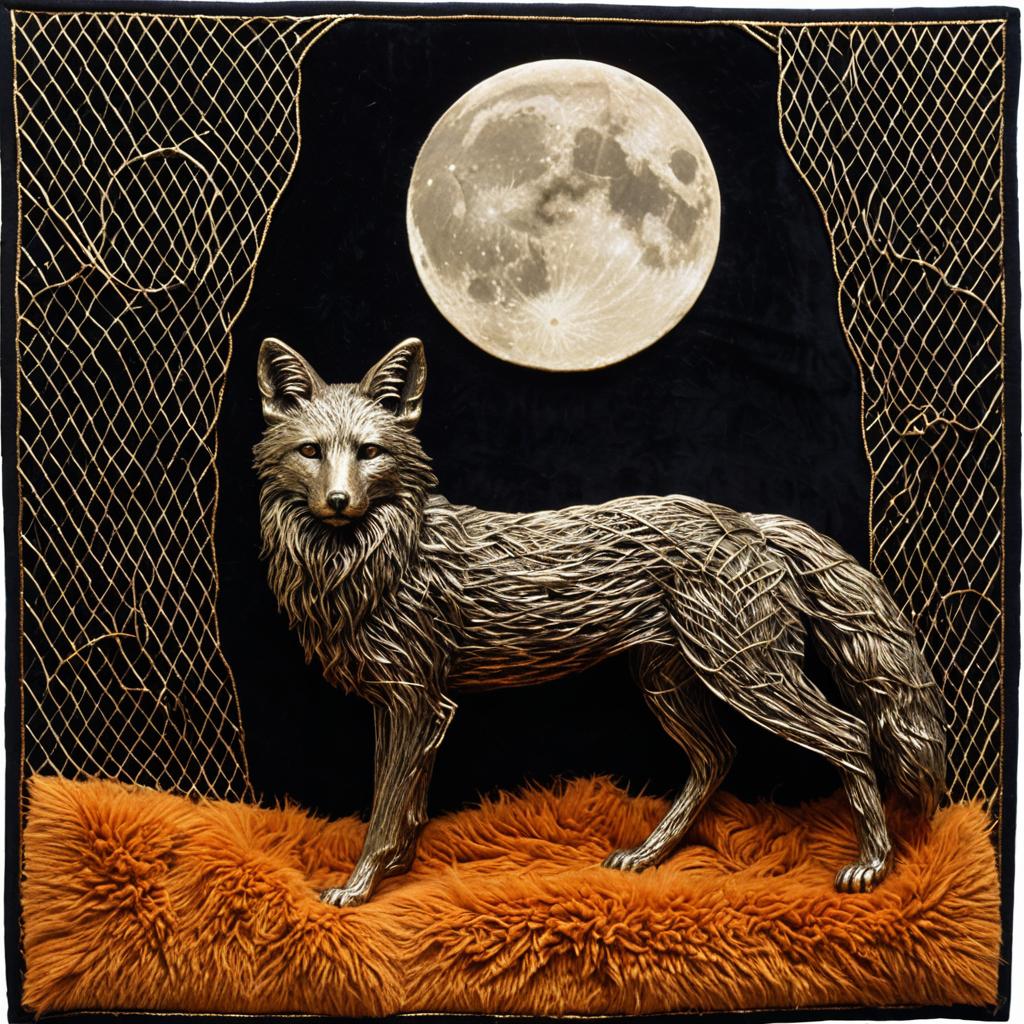Fox and Lantern, abstract expressionism, soul, hand-blown glass, velvet quilt background, fur, felt, beards and legs, ultra high definition sculpture by Banksy.