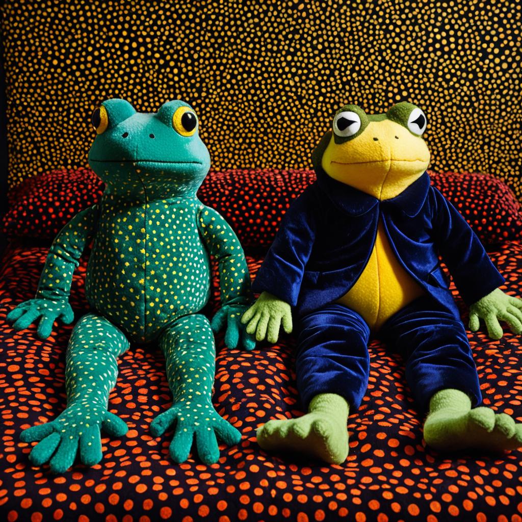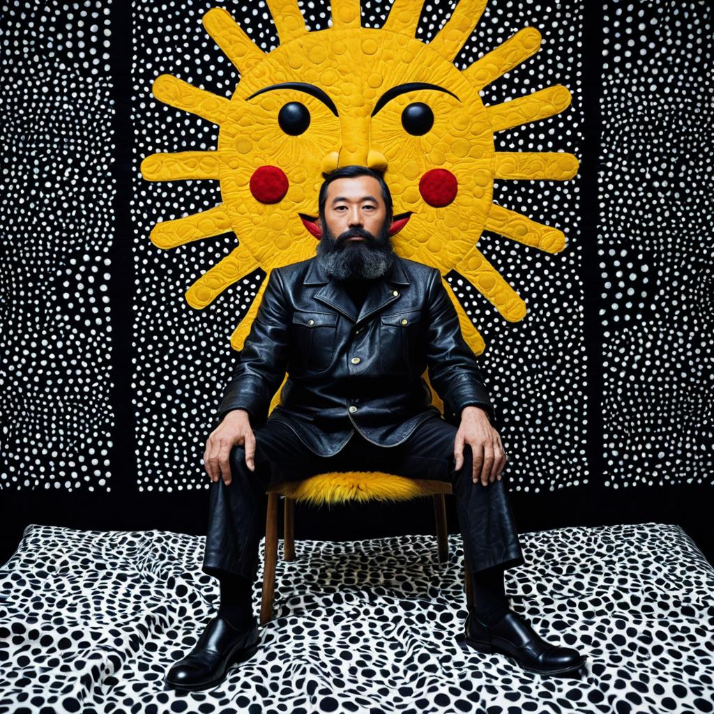 A bearded man with gray and black hair, wearing a black leather jacket with a red collar, beige pants, dark socks, and black shoes, sits on a quilted surface. Next to him is a large, detailed orange and white fox sculpture. A glowing lantern hangs on a deep teal, quilted velvet background, creating a moody, artistic scene.