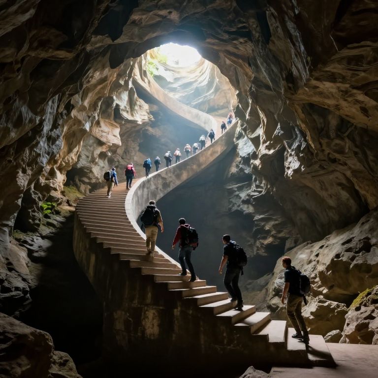 Photograph of a cave entrance with a spiral stone staircase in the foreground, leading upwards to a bright, sunlit opening. A group of hikers, wearing outdoor gear and backpacks, ascend the stairs. The cave walls are rugged and textured, illuminated by natural light from above, creating a dramatic contrast between the dark interior and the bright outside. The hikers are silhouetted against the light, with some casting shadows on the stairs. The overall composition highlights the natural beauty and adventurous spirit of cave exploration.