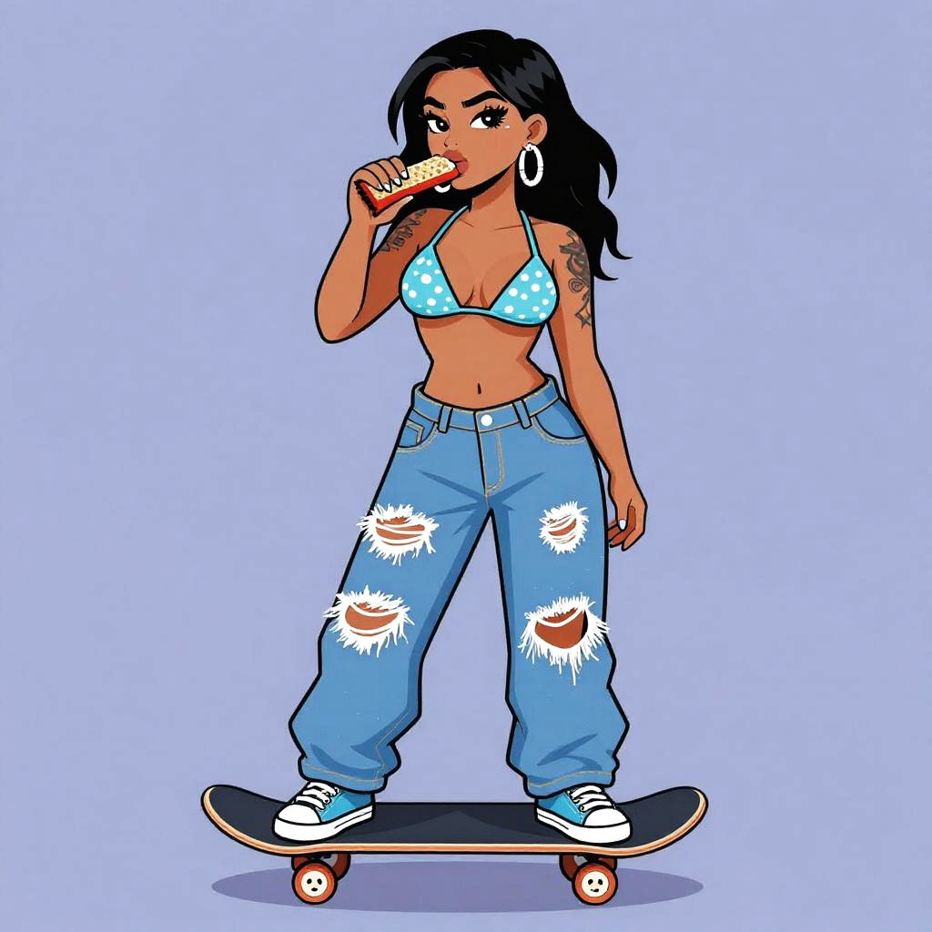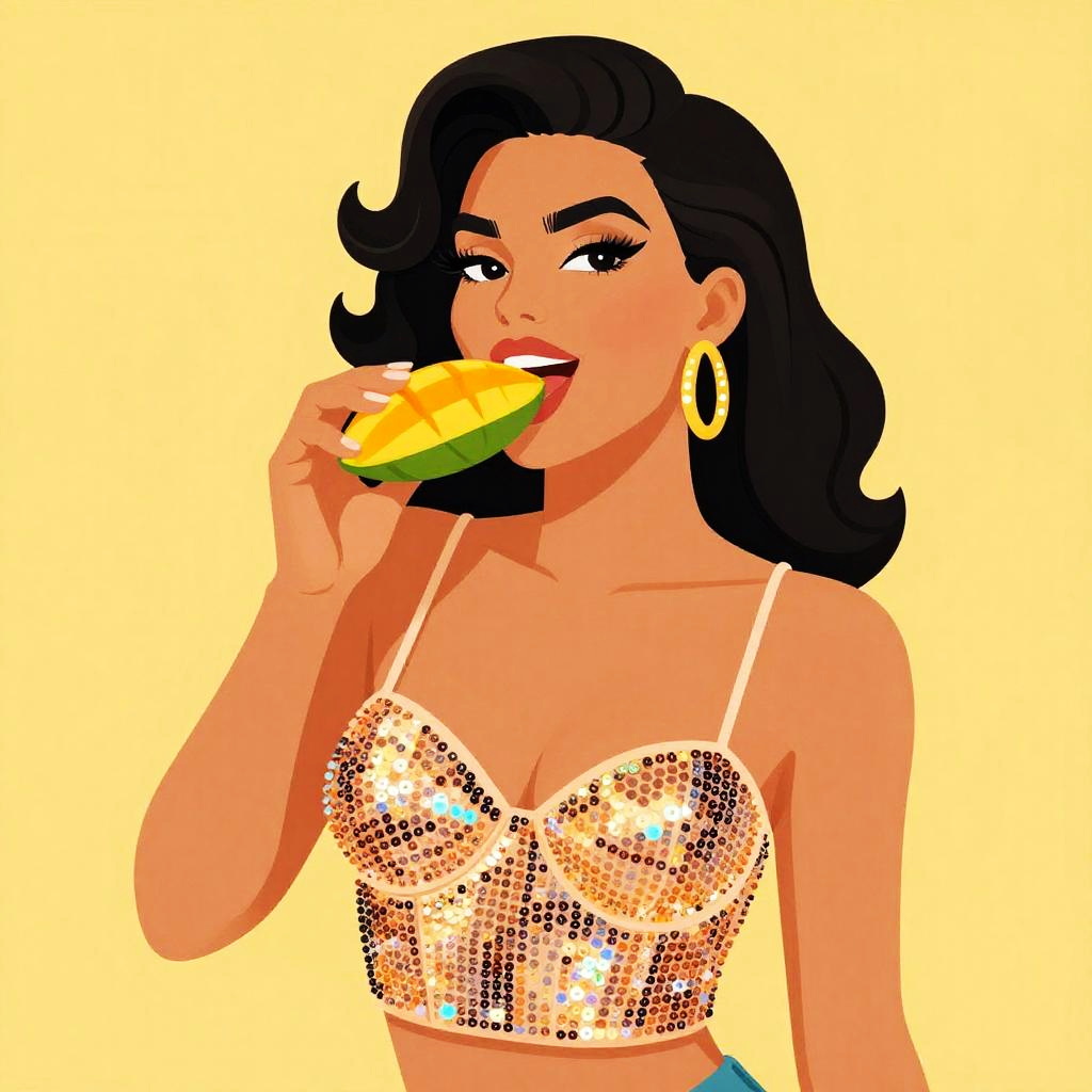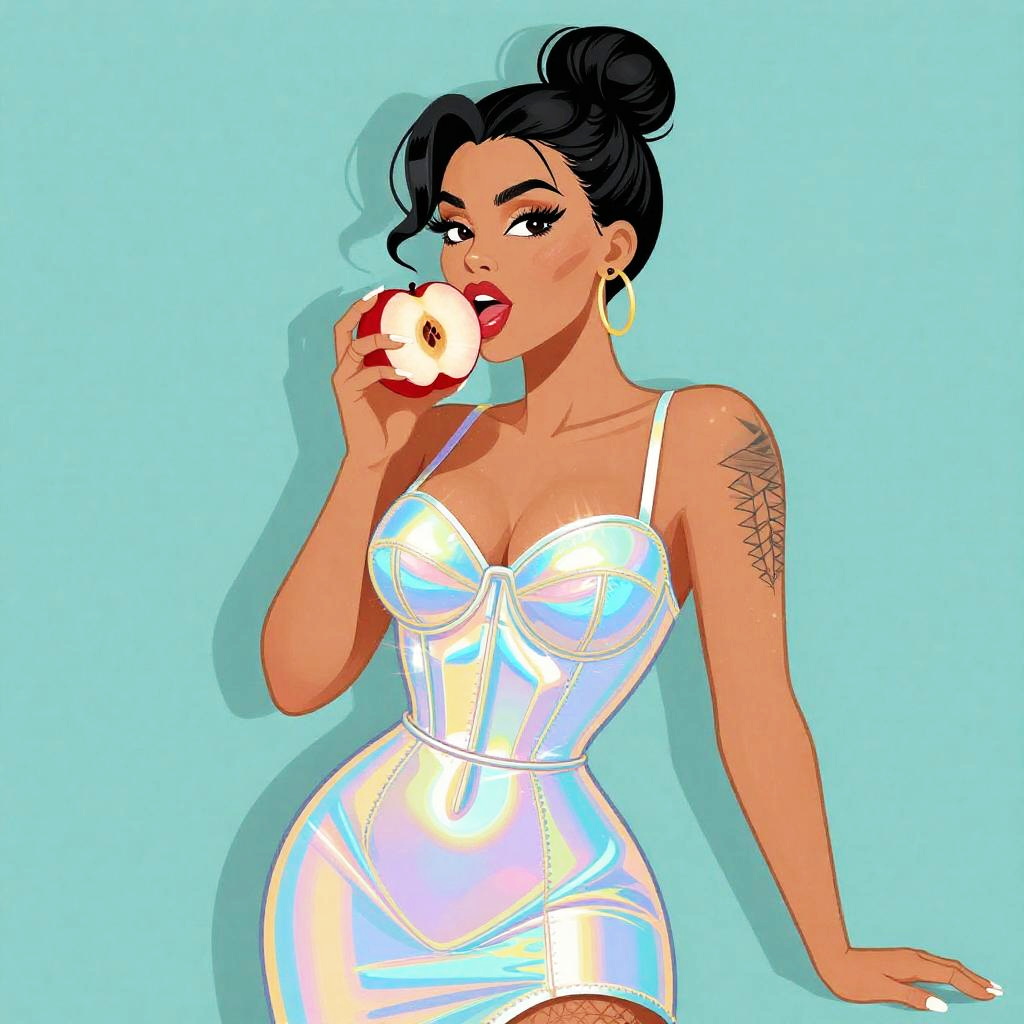 Vector illustration of funky robot diva hip-hop character female with extra large revealing cleavage and holographic bodycon dress eating a nectarine