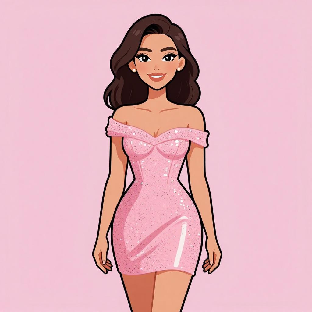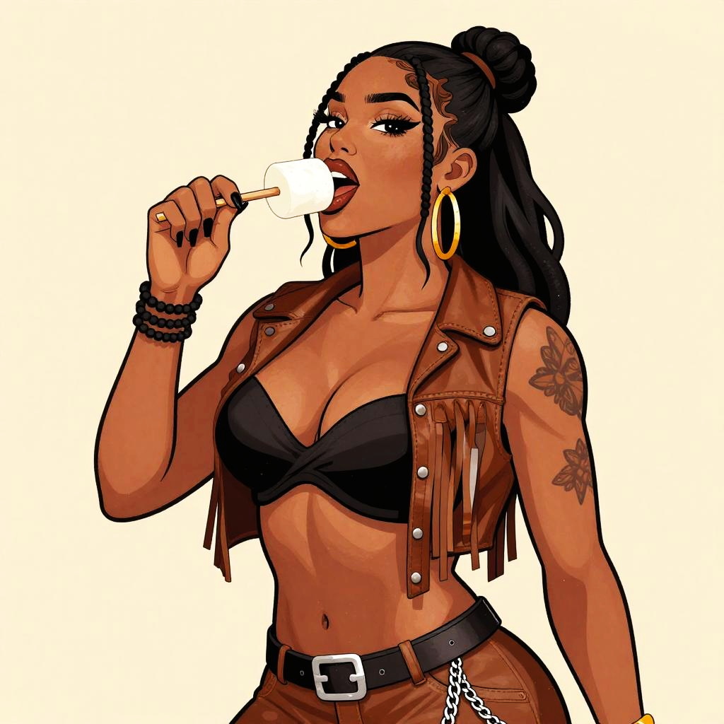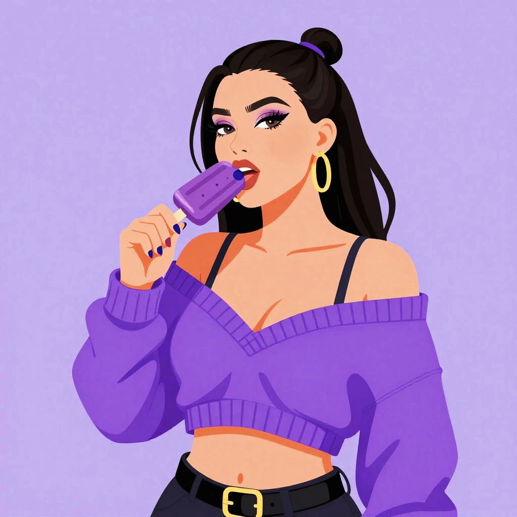 Vector illustration of funky robot diva hip-hop character female with extra large revealing cleavage and holographic bodycon dress eating a nectarine