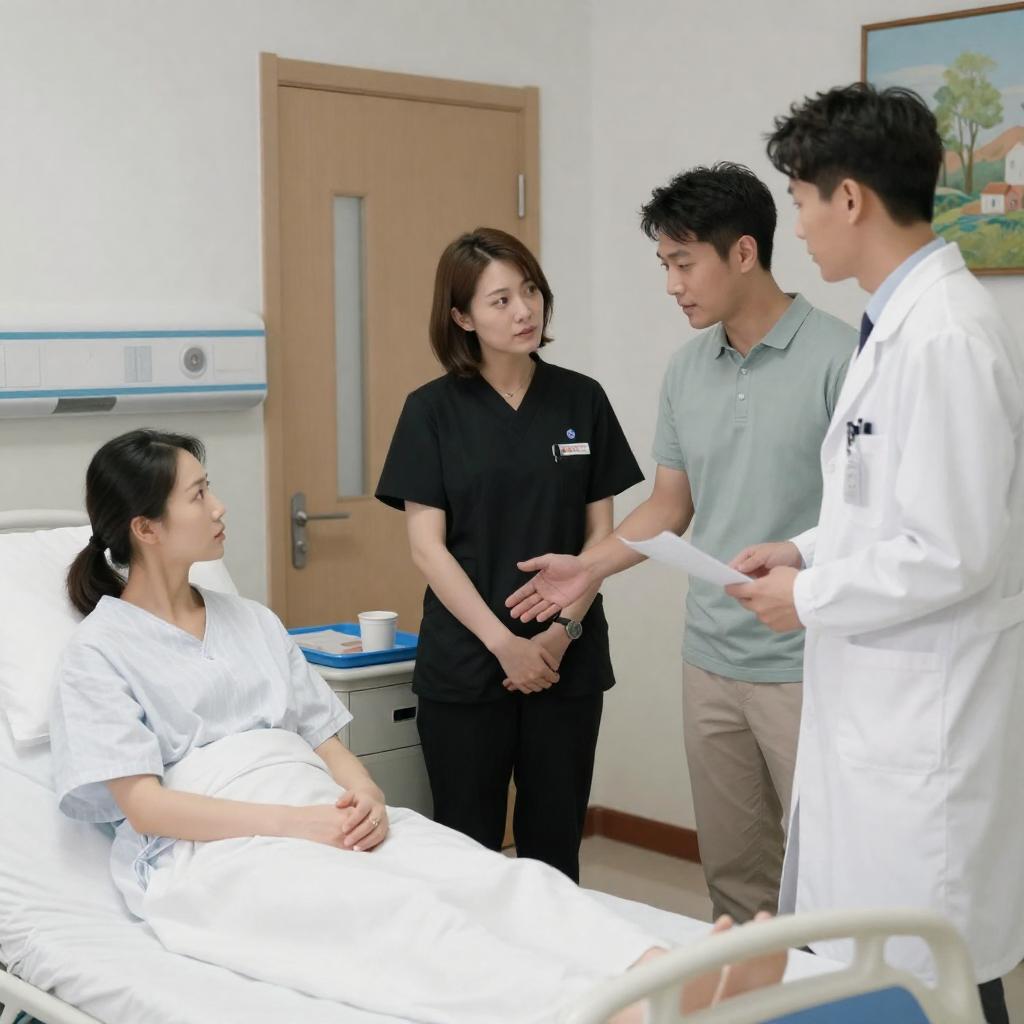 Photograph of a hospital room. Three people: a woman in a black uniform with short brown hair, clasping her hands; a man in a light green shirt with short dark hair, extending his hand; a man in a white lab coat holding papers. A woman in a white robe sits in a hospital bed on the left. The man in green is leaning towards the woman in black. Door ajar in the background. Painting on the wall. Blue tray with cup on bedside table.