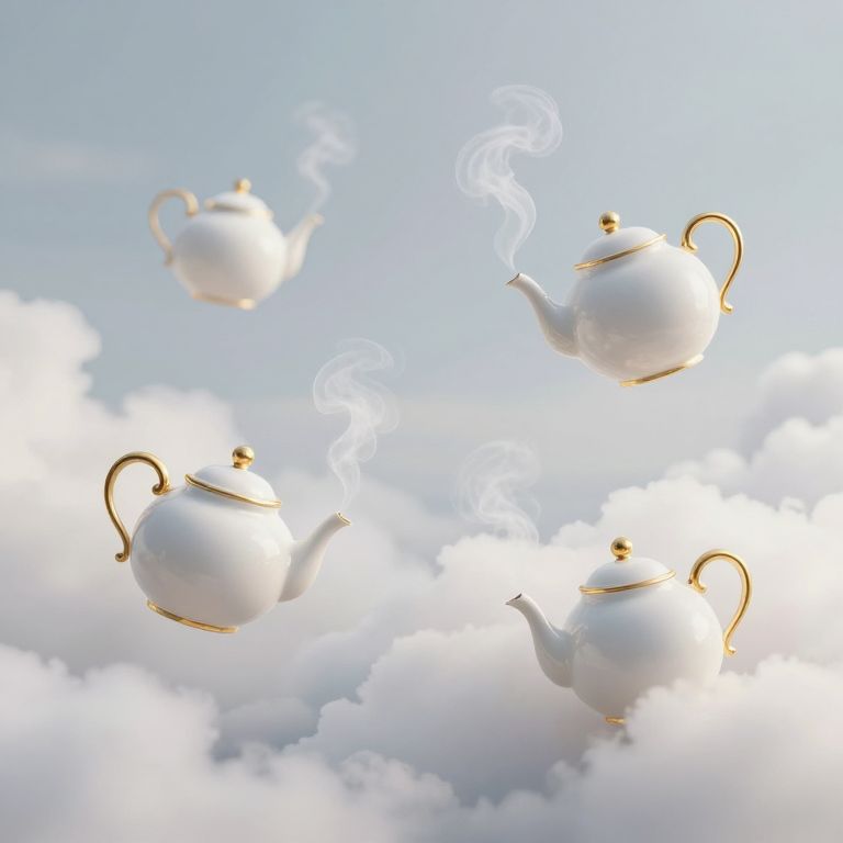 Sentient teapots float serenely amidst fluffy white clouds, their golden handles gleaming as they emit wisps of steam that dance gracefully against the ethereal backdrop.