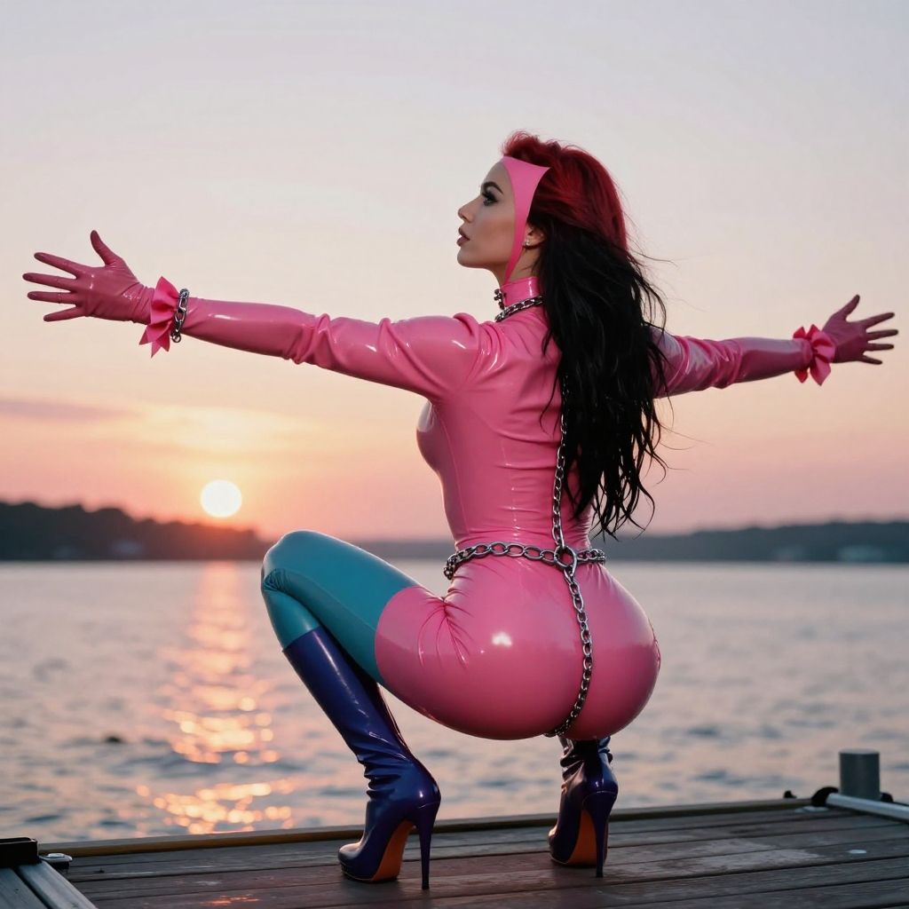 Cinematic photo cinematic photo cinematic photo raw photo, nsfw, 8k, hd, masterpiece, ultra realistic, from behind . 35mm photograph, film, bokeh, professional, 4k, highly detailed, side view, Sitting on a dock feet in the water watching the sunset with awe., 90-60-90, big breasted, 29 yo, beautiful bimbo sex drone femdom Mistress in pink total latex enclosure, long black red hair, different pose, high detailed eyes, high heel stiletto boots, bdsm chains, multicolored, wet suit, shoes, over-the-knee socks, ribbon-trimmed sleeves, Balancing on tiptoes with arms outstretched . 35mm photograph