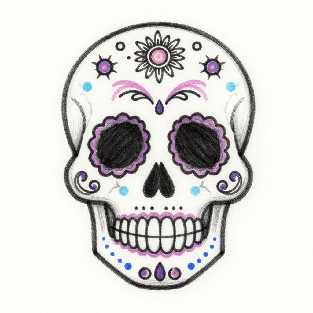 This is a digital drawing of a sugar skull, a traditional Mexican Day of the Dead (Día de los Muertos) symbol. The skull is white with black, hollow eye sockets and a black triangular nose. It features purple floral patterns around the eyes and mouth, with blue dots and swirls on the lower jaw and cheekbones. A pink flower with a black center adorns the forehead. The background is plain white, emphasizing the colorful skull design. The style is vibrant and decorative, with bold outlines and a playful, festive aesthetic.