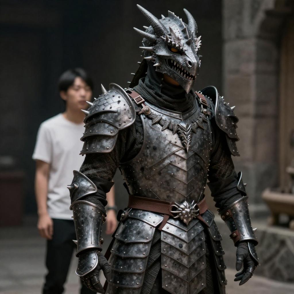 Photograph of a person in detailed, scaly dragon armor standing in a dimly lit stone room. Another person in a white shirt stands in the background. Dragon armor is metallic gray with spikes. Background includes stone walls and shadows. Second person's face is not visible.