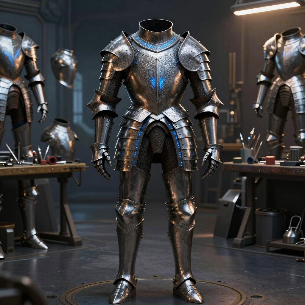 Armor designer crafting an elaborate medieval suit of armor, detailed metalwork with engravings, glowing blue runes along the edges, set in a futuristic workshop filled with high-tech tools and armor pieces, ambient lighting highlighting the textures