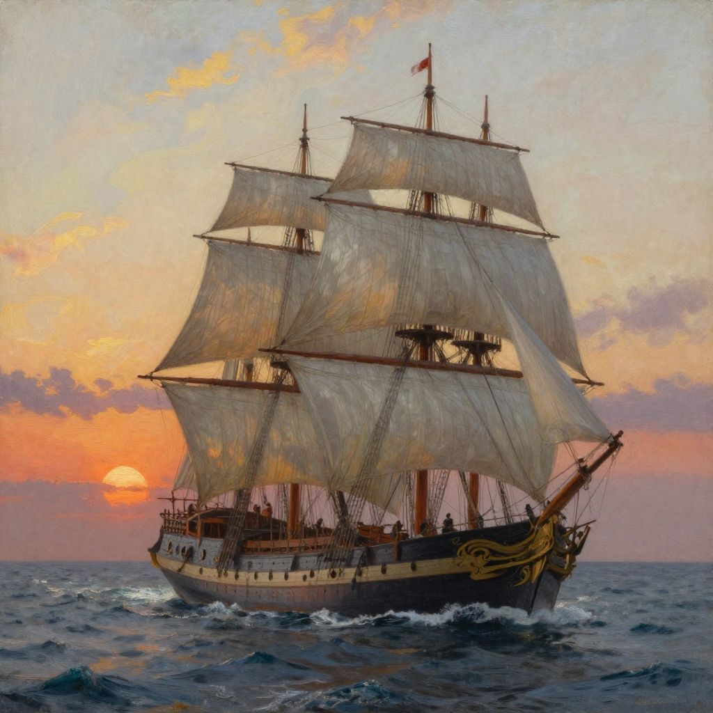 Photorealistic painting of a majestic, three-masted sailing ship with billowing white sails, navigating through ocean waves at sunset.