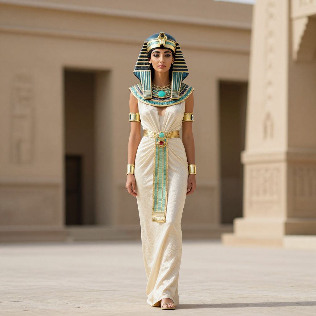 Egyptian queen dress, a woman in a pharaoh costume standing in front of a building