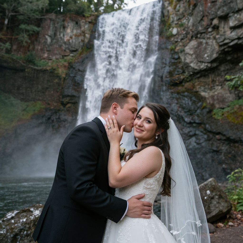 A photograph captures a bride and groom standing in front of a cascading waterfall. The bride, with brown hair in an updo, wears a white lace strapless gown with a long train, while the groom, with short brown hair, is dressed in a black tuxedo with a white boutonnière. They are kissing, with the groom's hands on the bride's waist and the bride's arms around his neck. The waterfall, surrounded by dark rocky cliffs and green foliage, creates a misty spray as it falls into a pool below. The couple stands on a stone path, with large rocks and a calm water pool in the foreground.