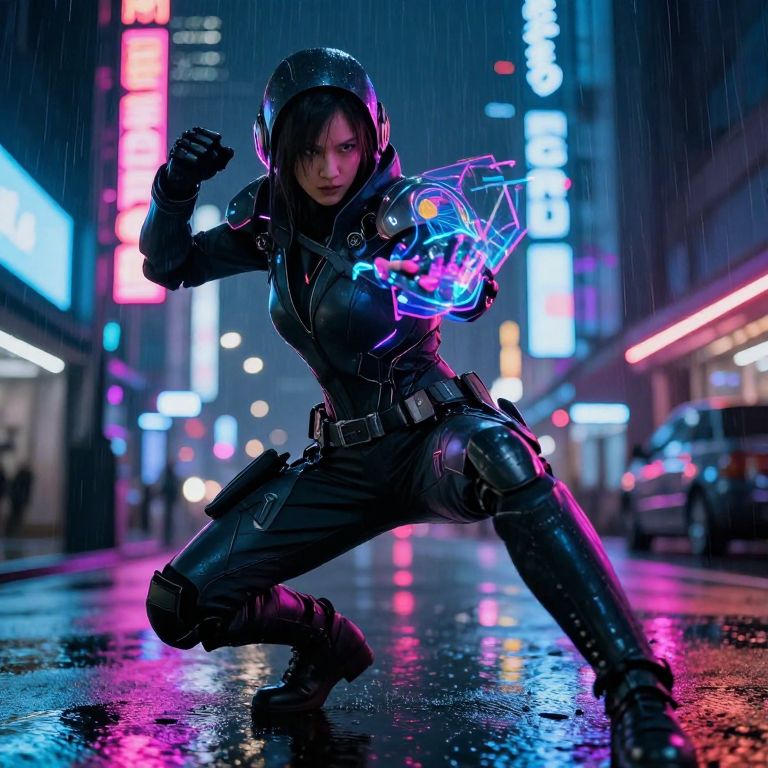 Charactera as a futuristic cyberpunk warrior, neon-lit urban environment at night, sleek armor with holographic elements, intense expression, rain-soaked streets reflecting vibrant signs, dynamic action stance, high contrast colors and detailed textures.