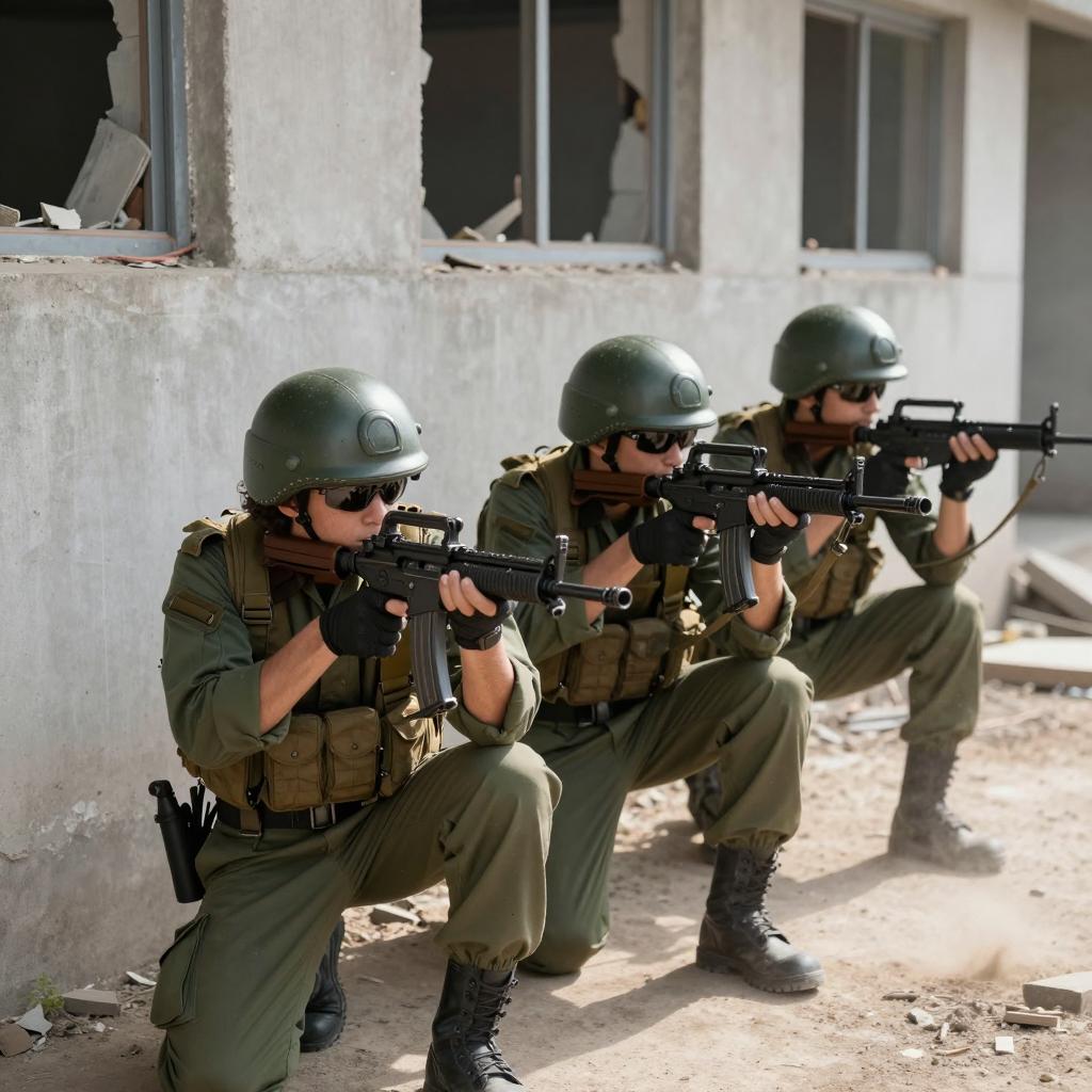 Crouching Soldiers in Urban Combat Scene