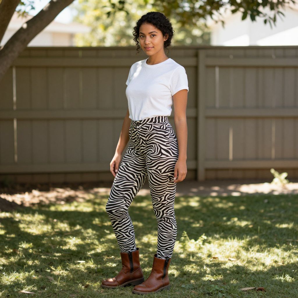 A young adult woman in her late 20s with warm brown skin, curly black hair tied in a loose bun, and kind, expressive eyes, wearing zebra print pants that are high-waisted and fit snugly around her hips, paired with a white t-shirt and brown leather boots, standing in a sunny suburban backyard with a wooden fence in the background and dappled sunlight filtering through the trees.